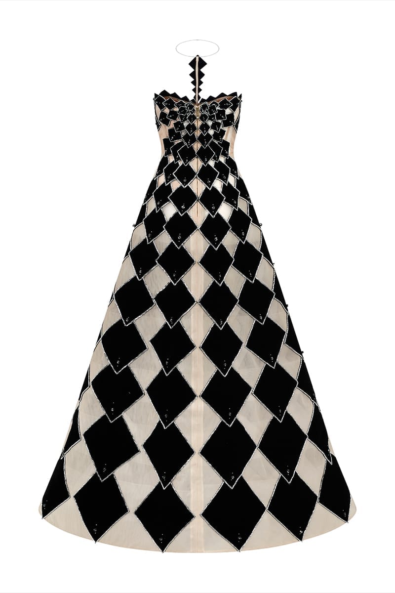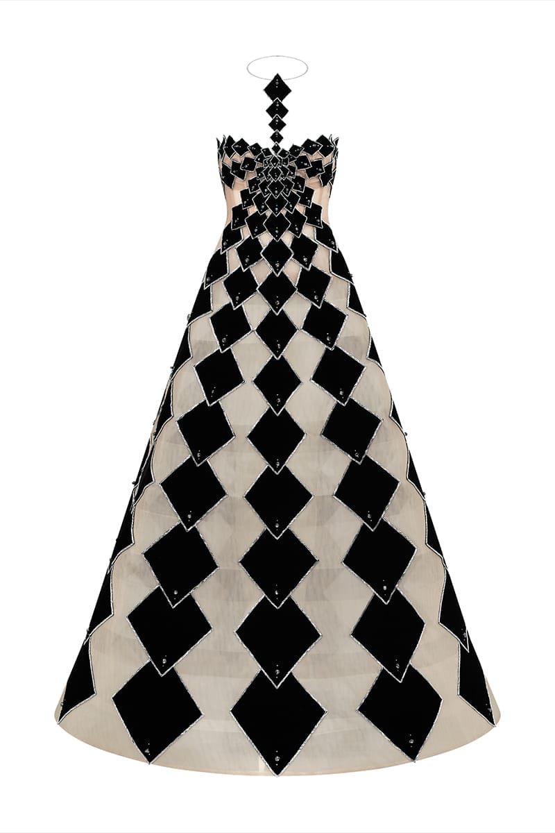 Black Velvet Cut-Out Off-the-Shoulder Maxi Dress, cut from velvet. This dress took 250 hours of hand-cutting and embroidery to complete and is truly a work of art.