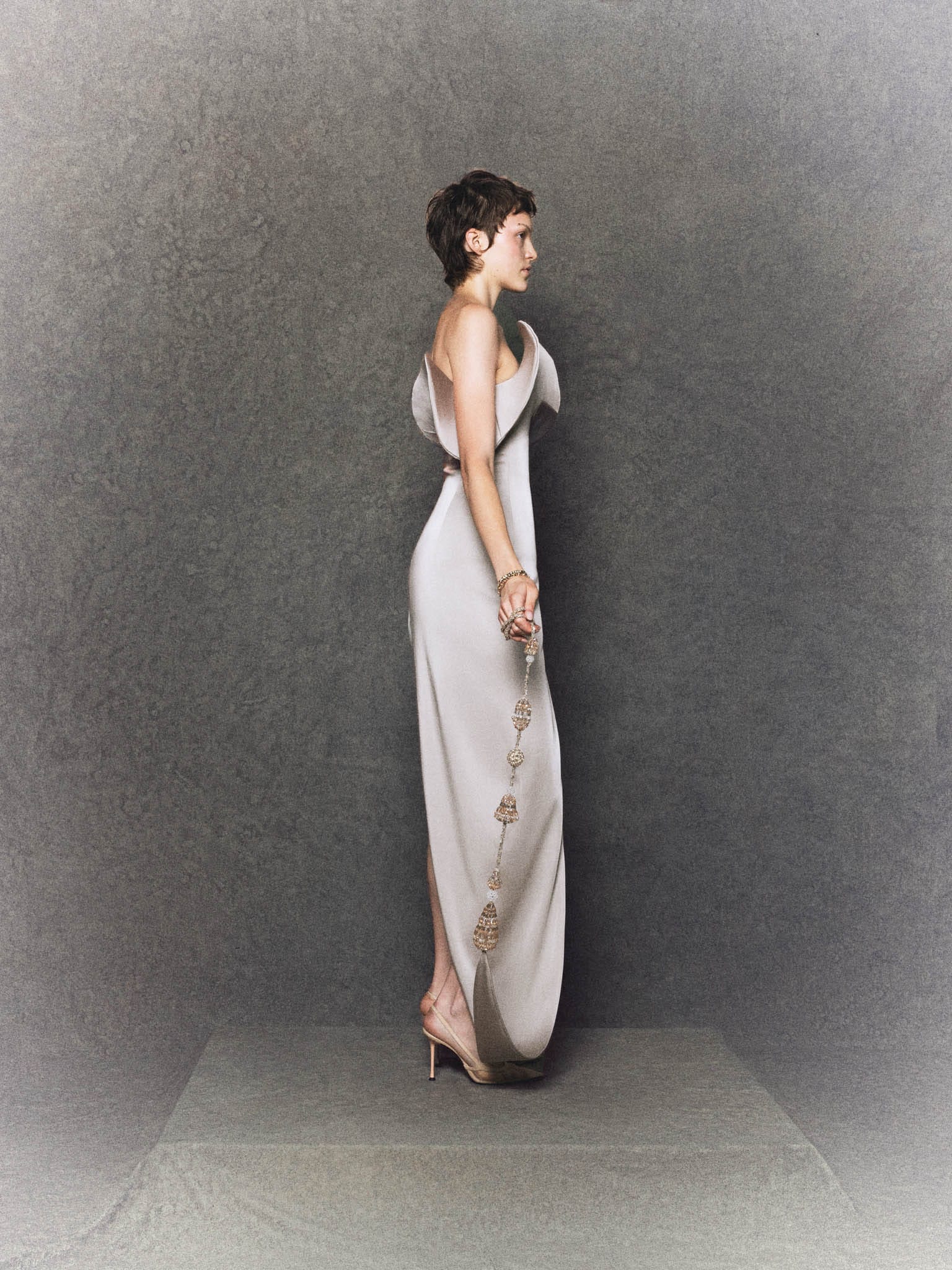 Inspired by the shimmering beauty of freshly caught fish, this asymmetric gray silk gown sculpts the body with refined elegance. One shoulder is left bare, while the other highlights a dramatic sculpted design, enhancing the gown’s couture silhouette. The soft gray silk bodice features pleated details reminiscent of glistening fish scales, paired with a crystal-embellished bust that adds luxurious sparkle.