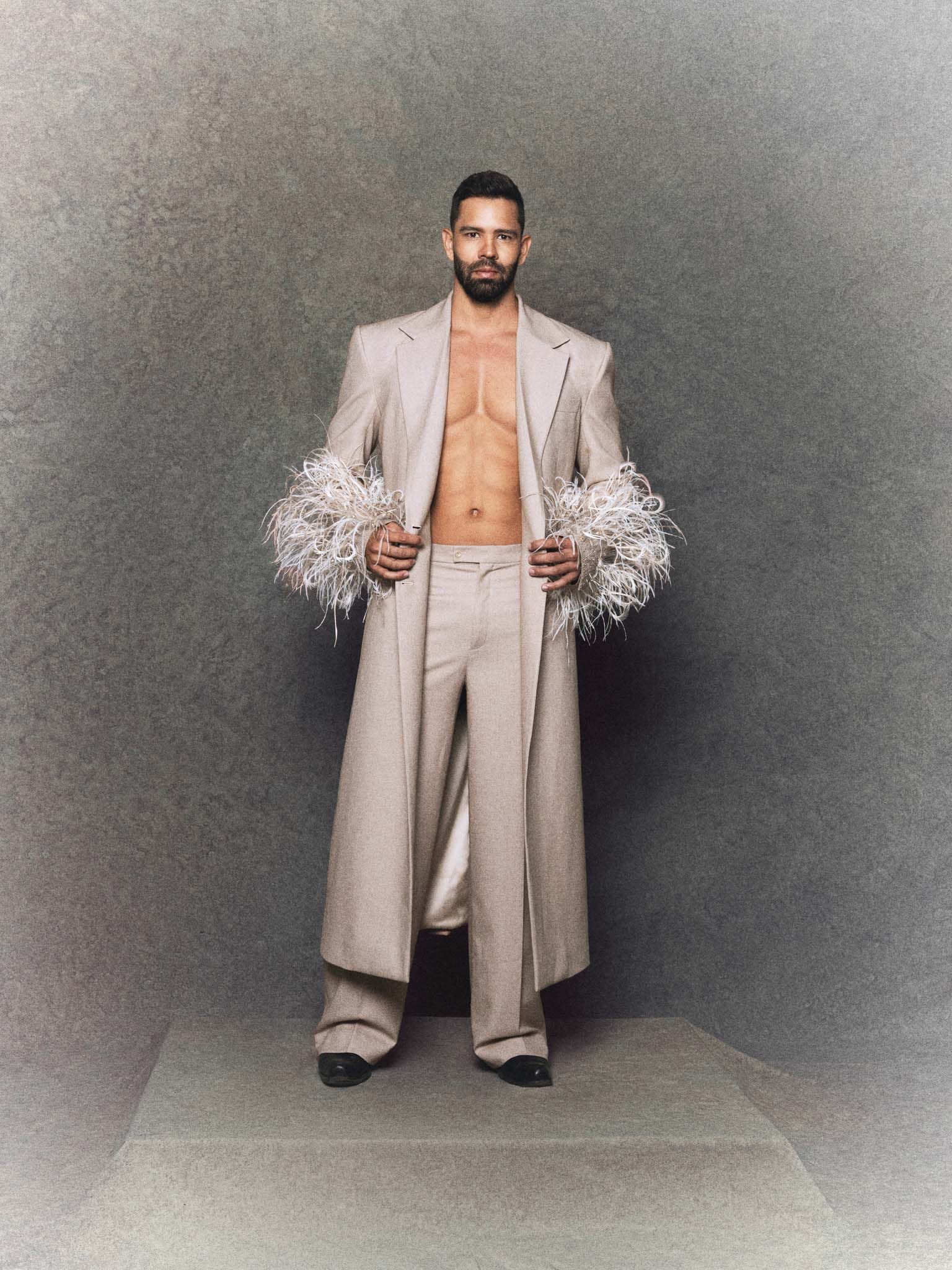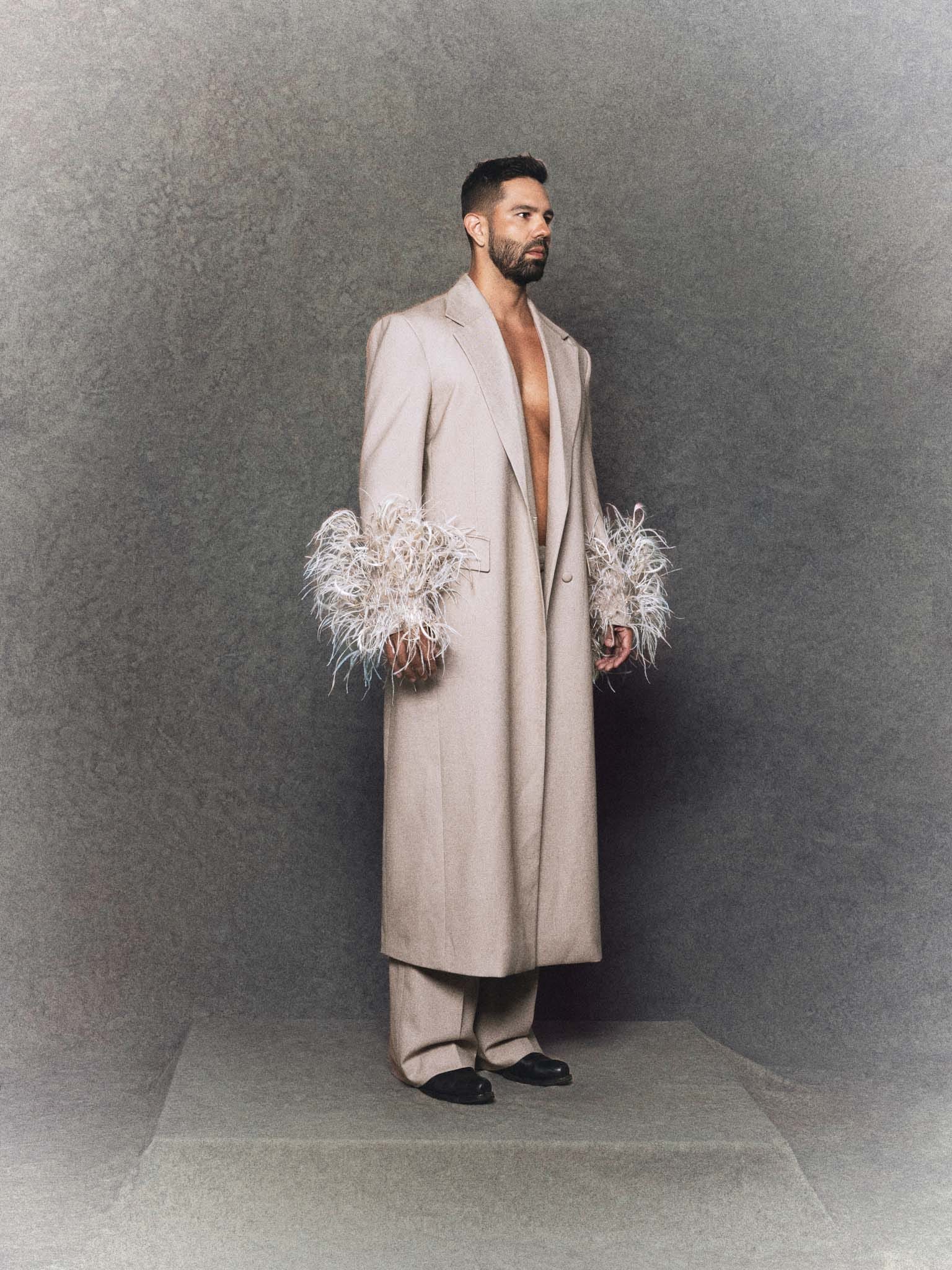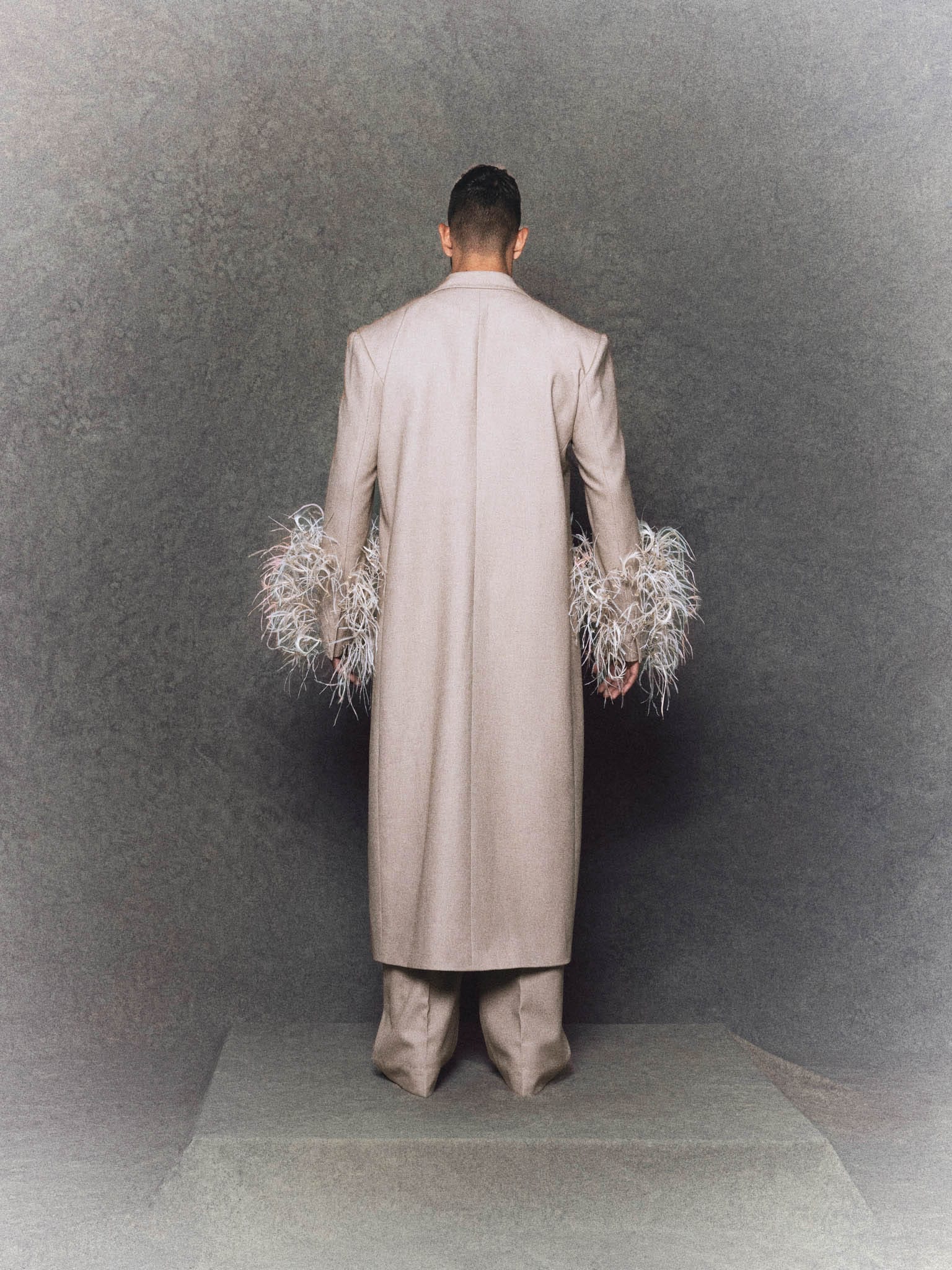 Elevate your outerwear collection with this Beige Wool Coat, featuring structured shoulders and a sleek, elongated silhouette for refined elegance. The sleeves are adorned with hand-applied ostrich and straw feathers, while tea-colored crystal accents add a subtle sparkle.