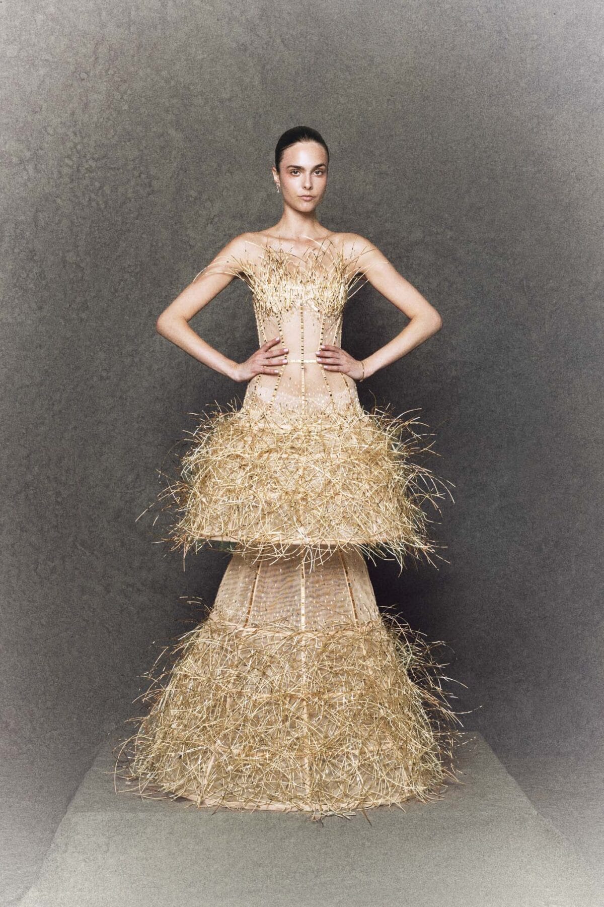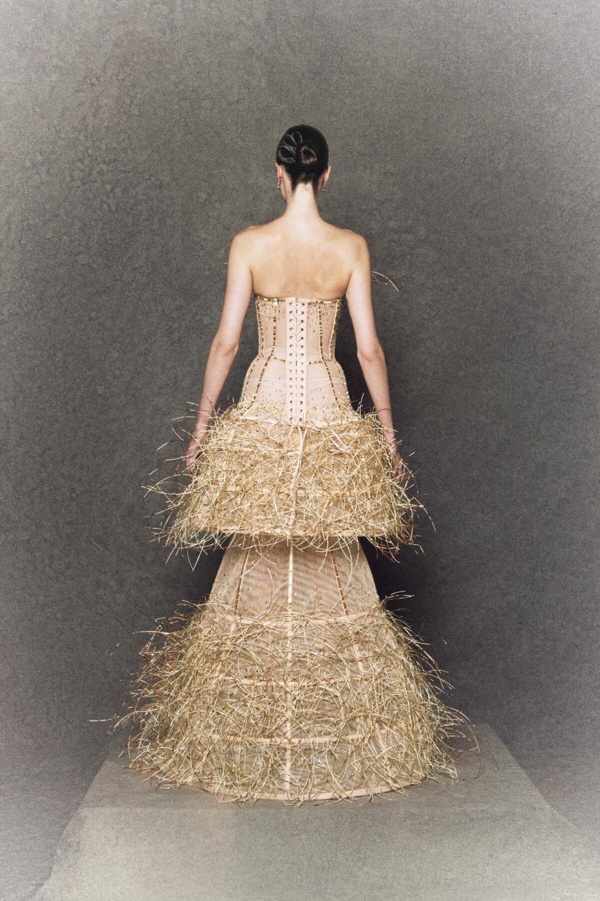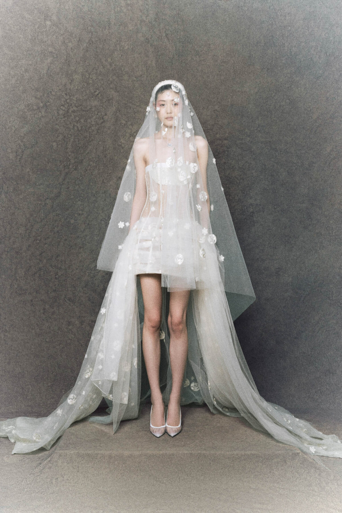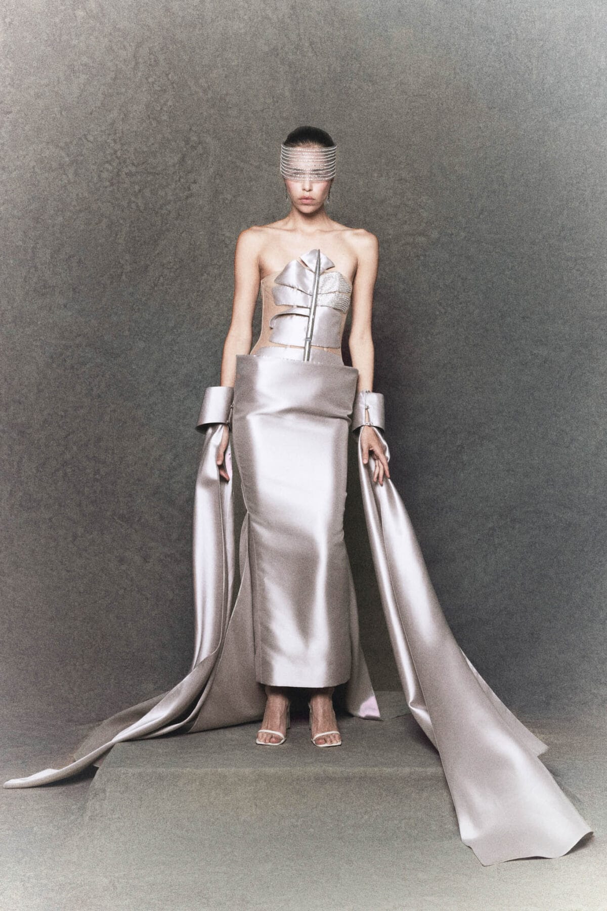 The outfit is a sheer dress with teardrop-shaped beadwork, paired with black gloves and a matching beaded headpiece, creating an elegant and dramatic look