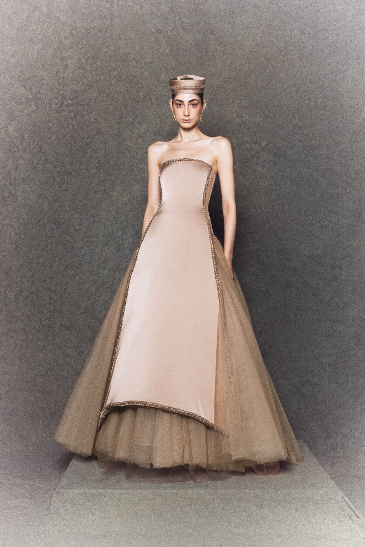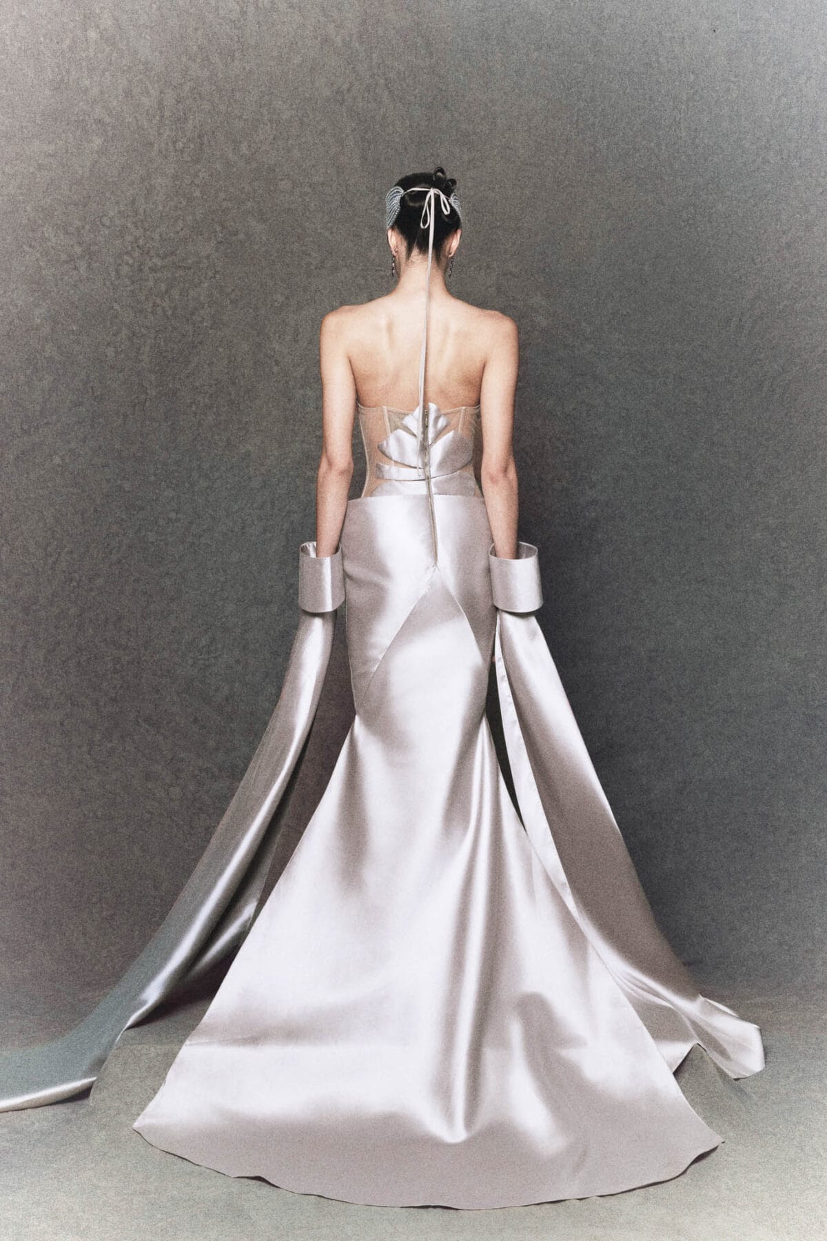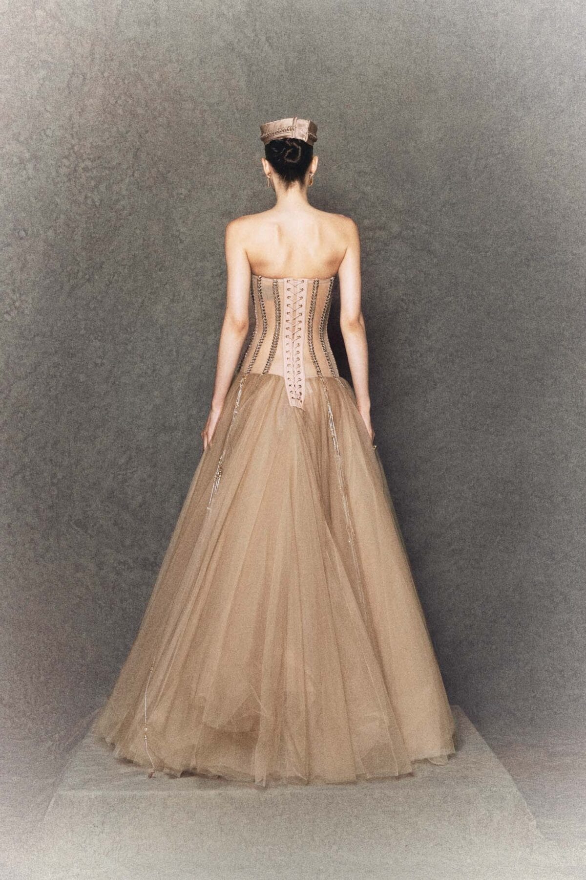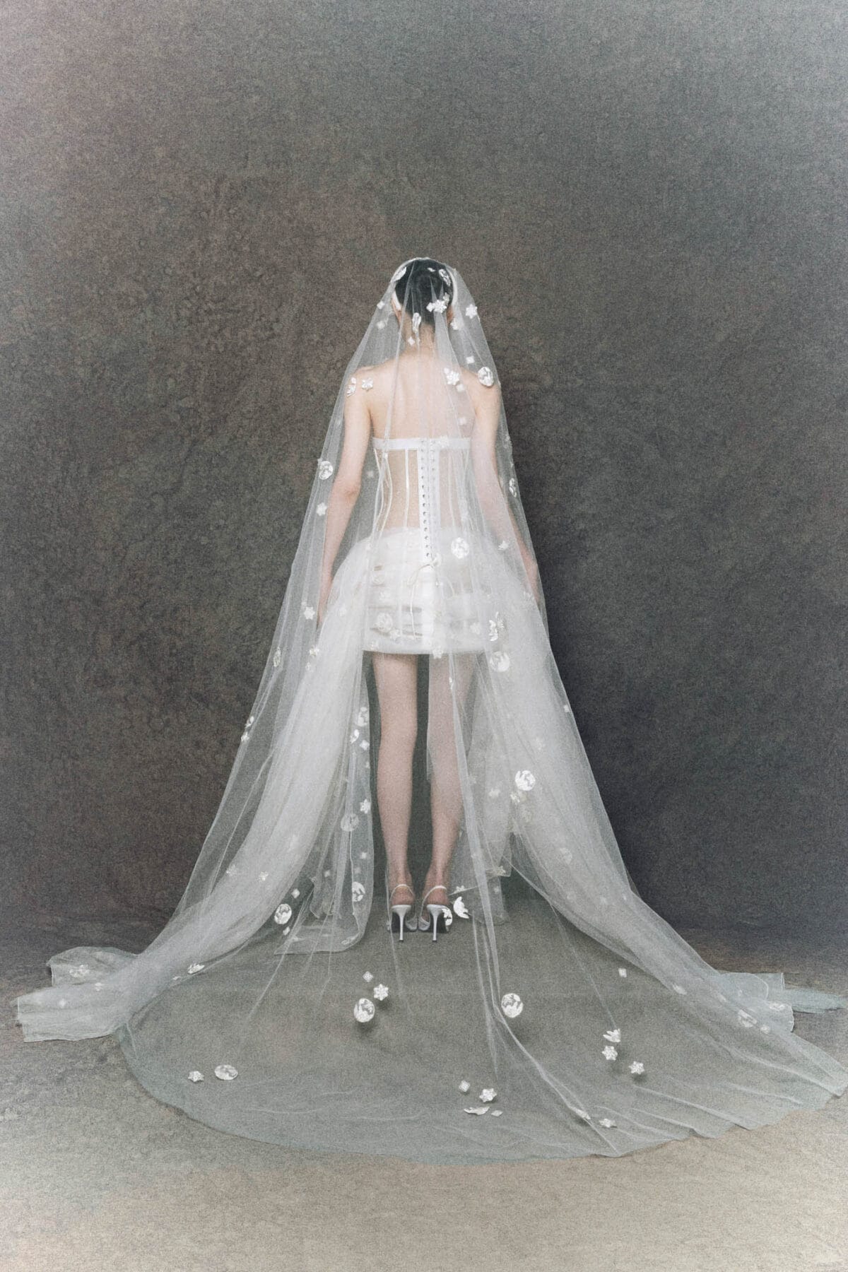 The outfit is a sheer dress with teardrop-shaped beadwork, paired with black gloves and a matching beaded headpiece, creating an elegant and dramatic look