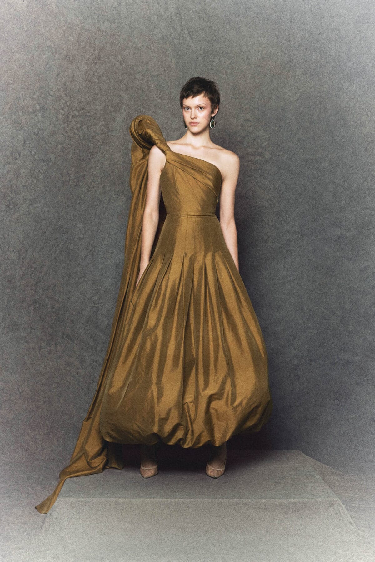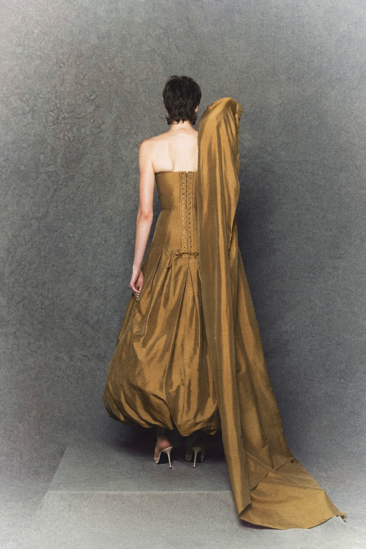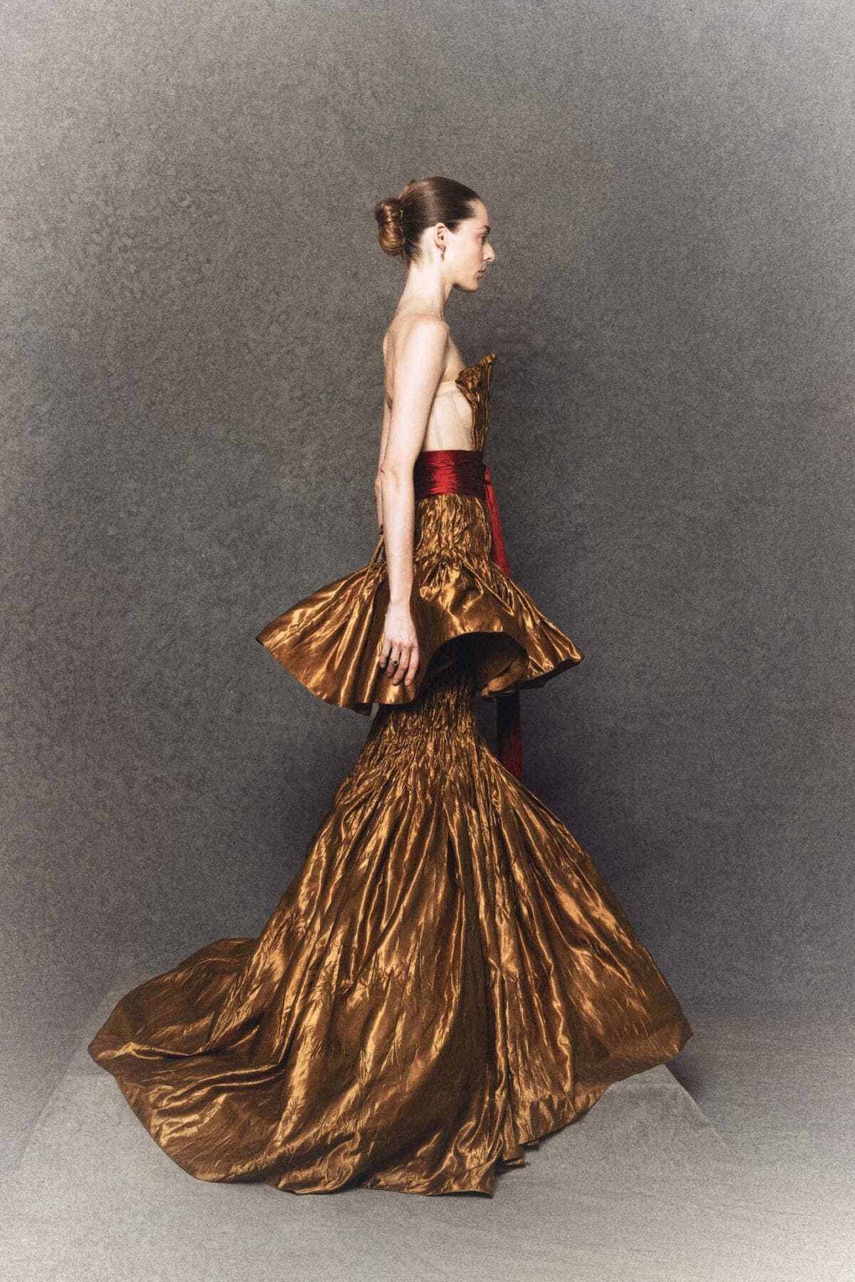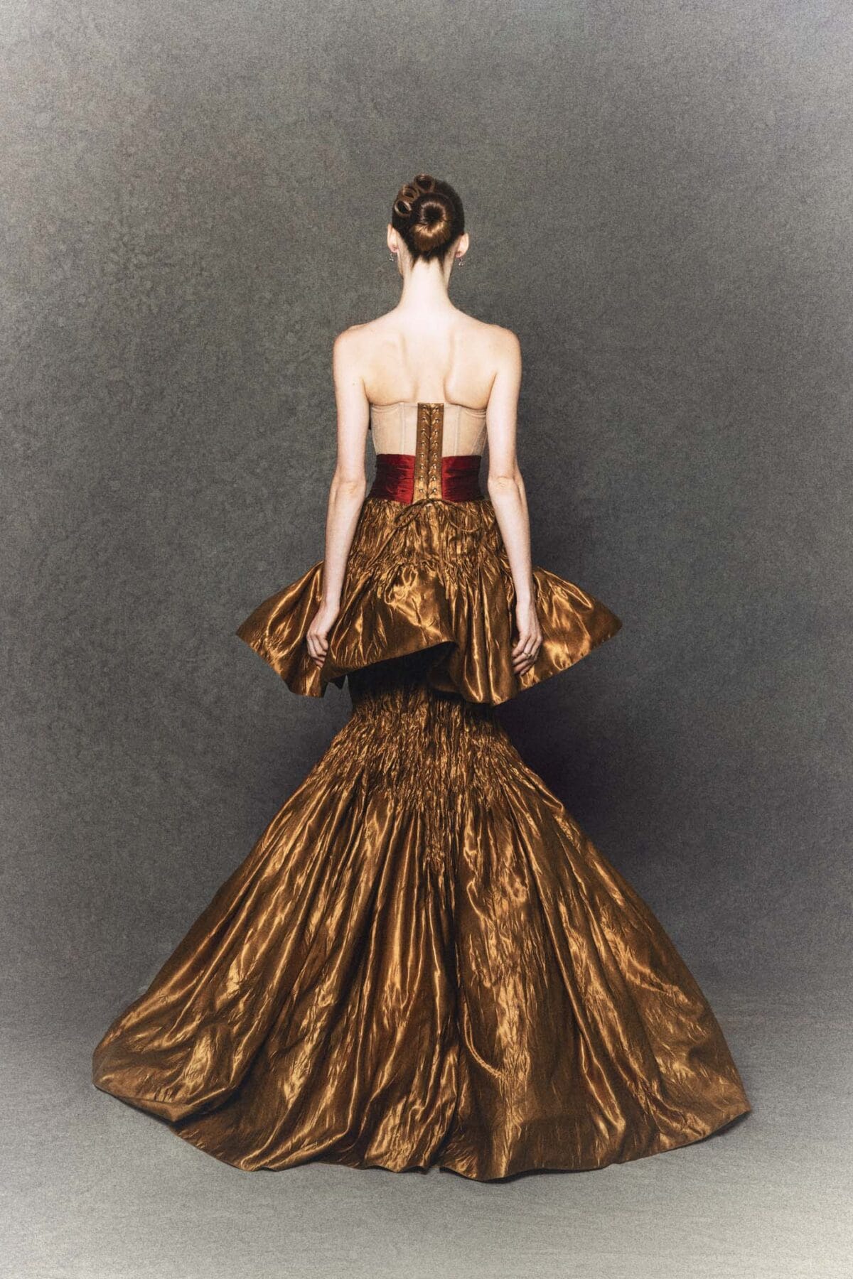 The outfit is a sheer dress with teardrop-shaped beadwork, paired with black gloves and a matching beaded headpiece, creating an elegant and dramatic look