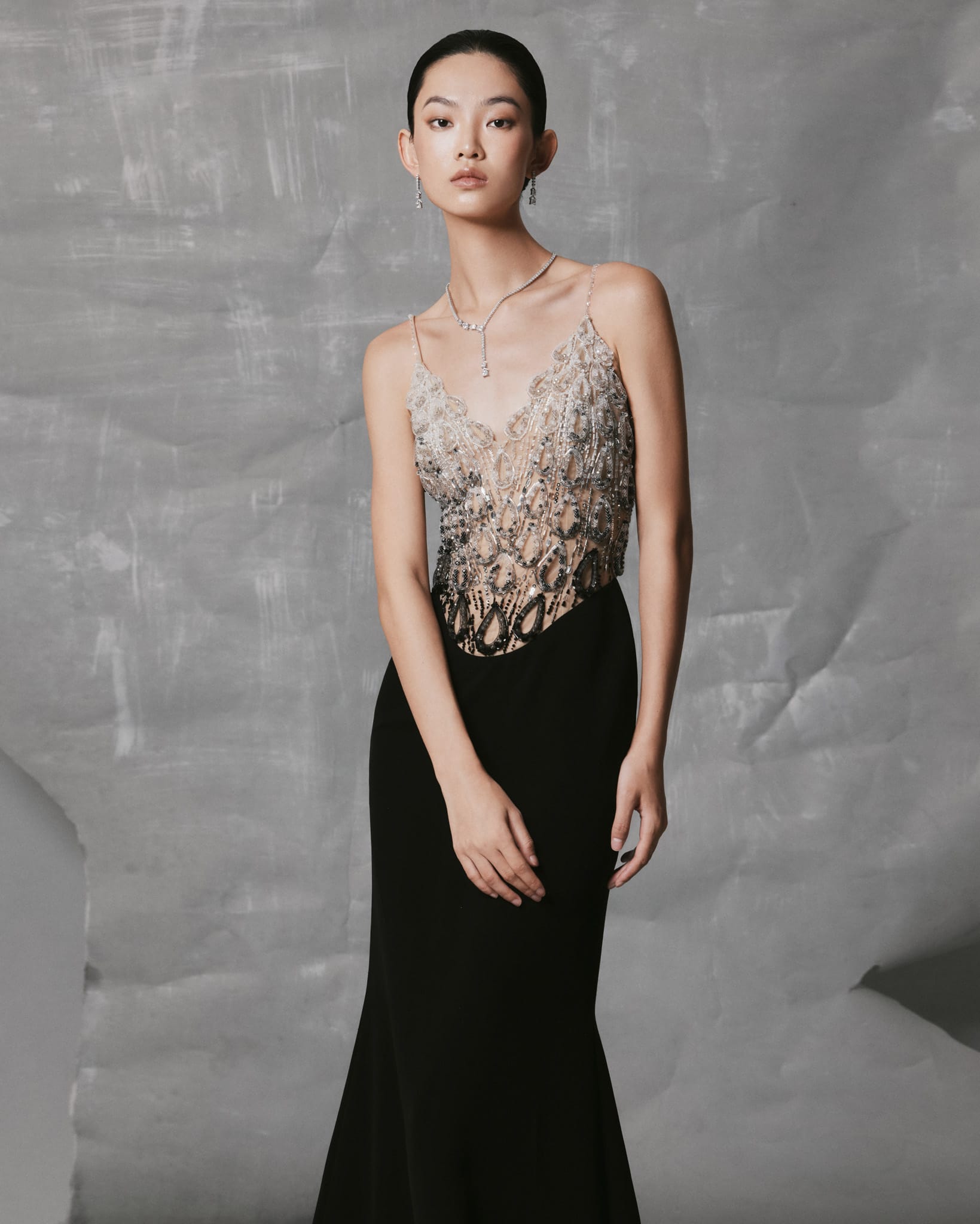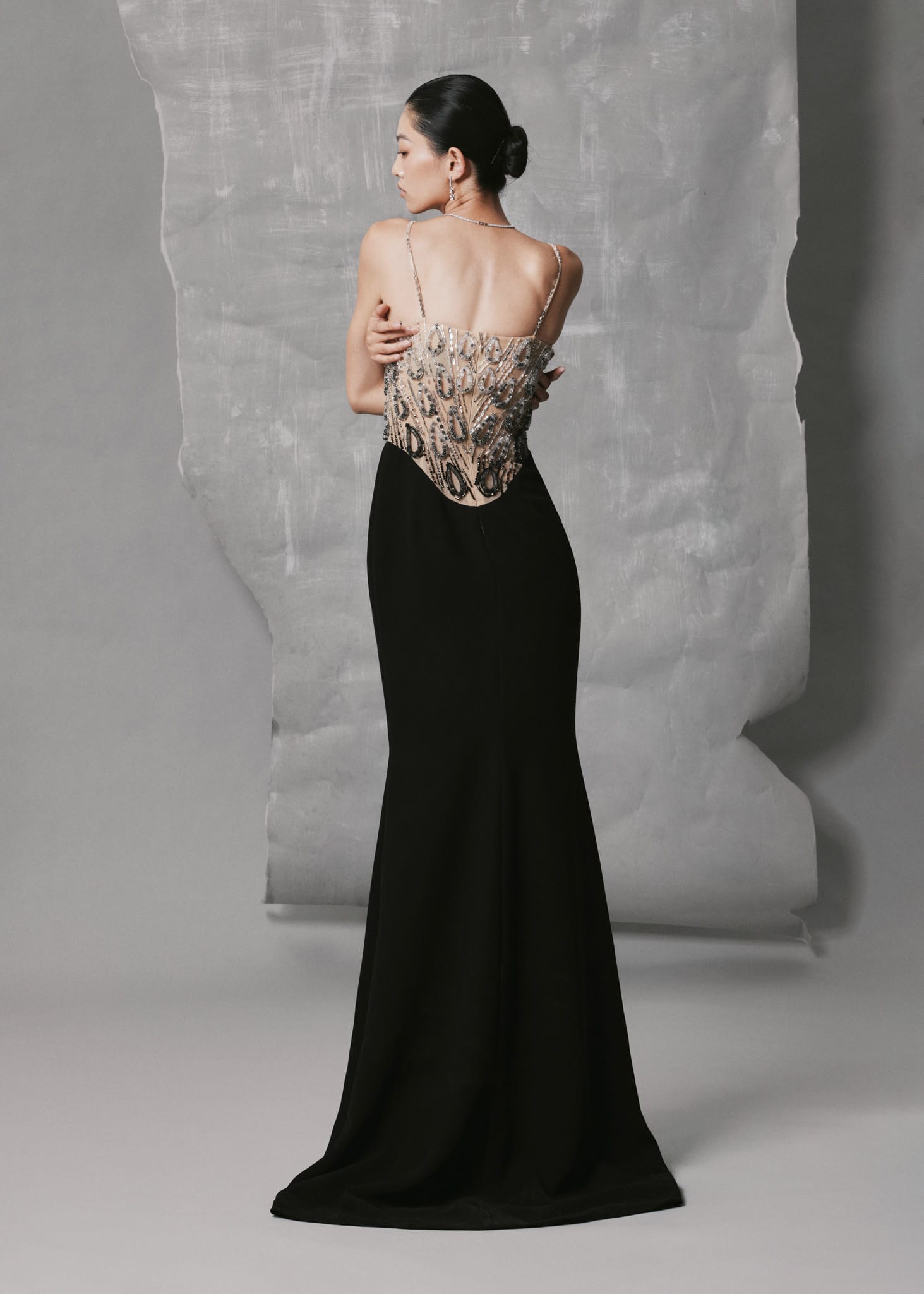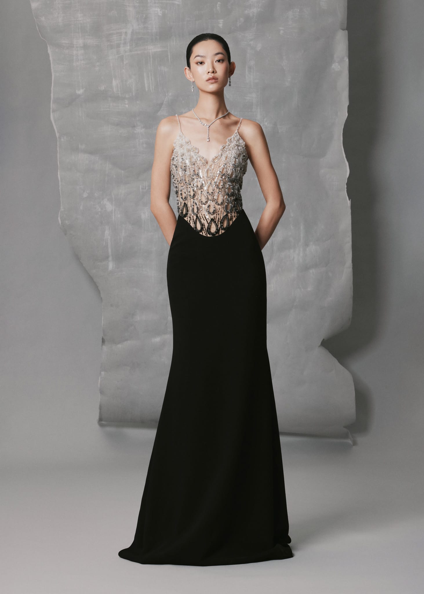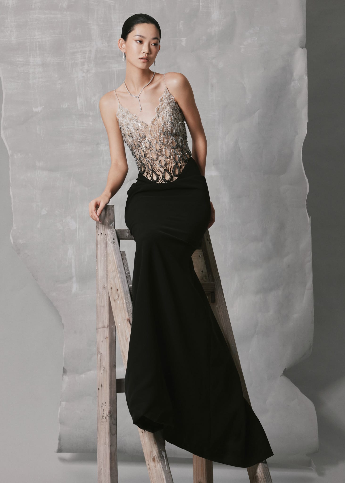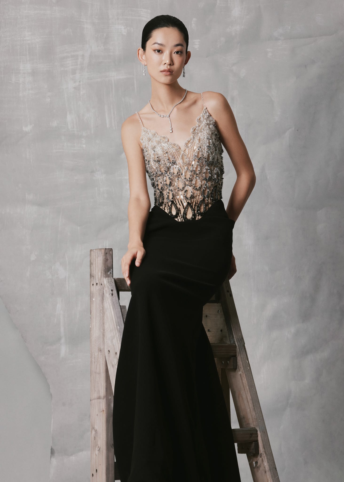 This Black Silk Gown showcases hand-shaped crystal drop motifs on a horsehair braid bodice, fading elegantly into a sleek black silk skirt. The straight silhouette elongates the figure, while the silk-mesh lining ensures comfort and structure. Designed for evening events or formal occasions, the gown balances sculptural detail with refined elegance.