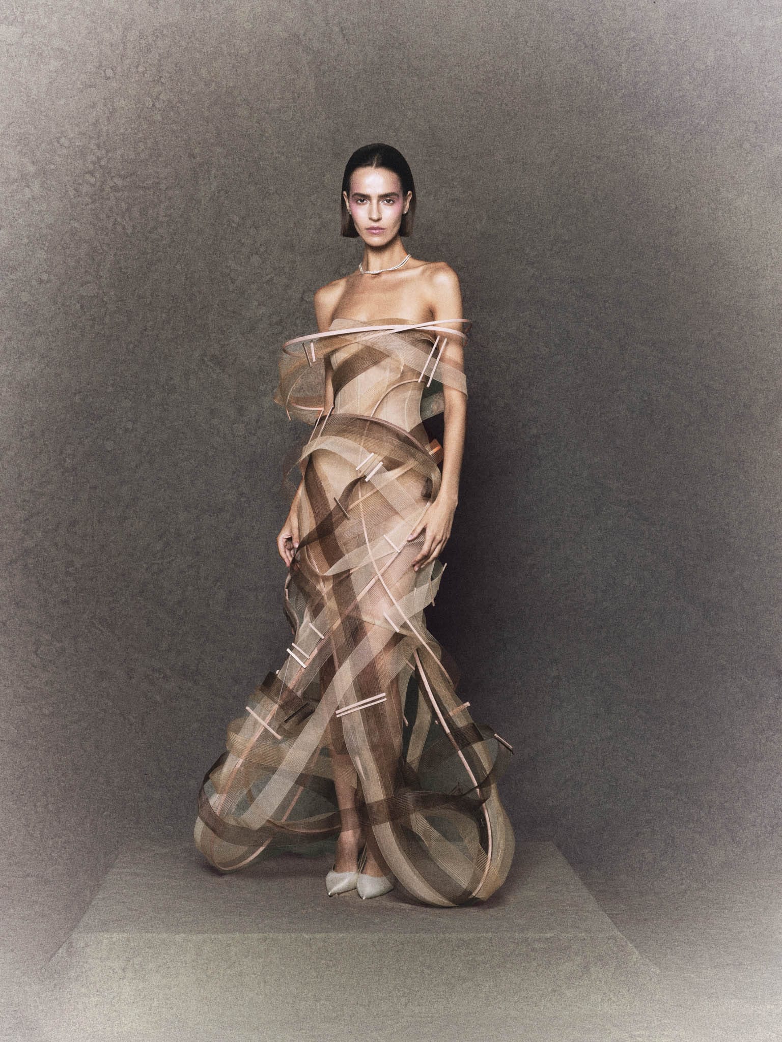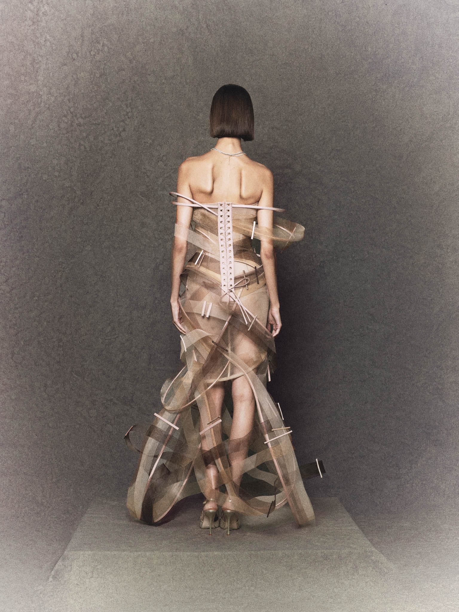 Its bamboo-slat inspired ribbing creates an architectural interplay of sheer texture and directional form, producing a captivating illusion of movement. Lightweight yet supported by an internal framework, the dress blends transparency, motion, and contemporary elegance-perfect for editorial styling, evening events, or statement-making occasions.