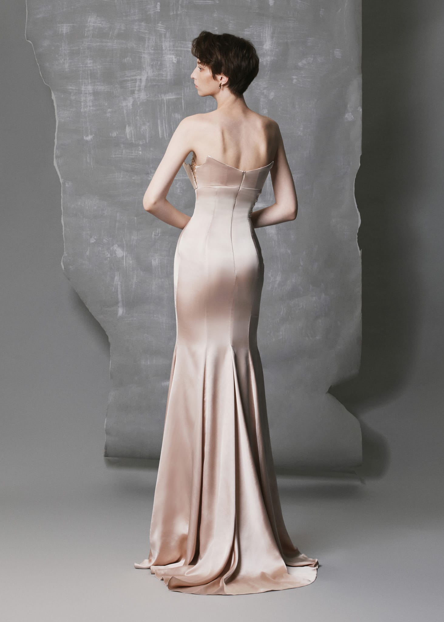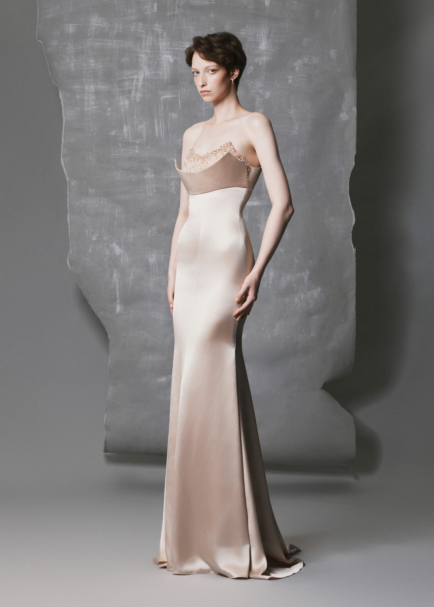 This champagne satin gown is crafted from luxurious satin and fully lined with smooth silk for refined structure and comfort. The fitted silhouette flows gracefully into a subtle mermaid hem, emphasizing elegance and poise. The bust cup is adorned with hand-applied crystal embellishments, creating a luminous focal point that contrasts beautifully with the soft satin sheen. Perfect for evening galas, formal events, or red-carpet occasions, this gown radiates timeless sophistication with a modern, polished finish.