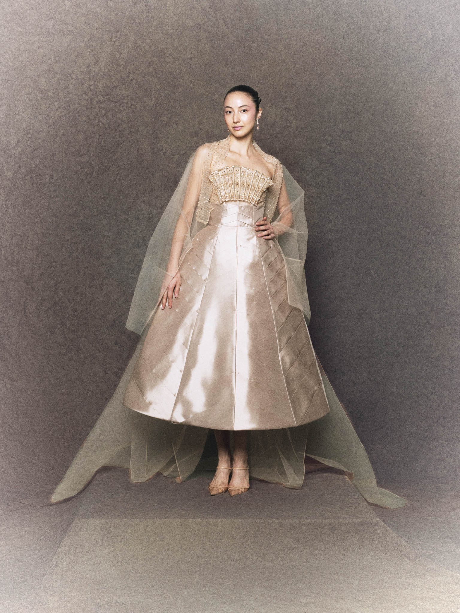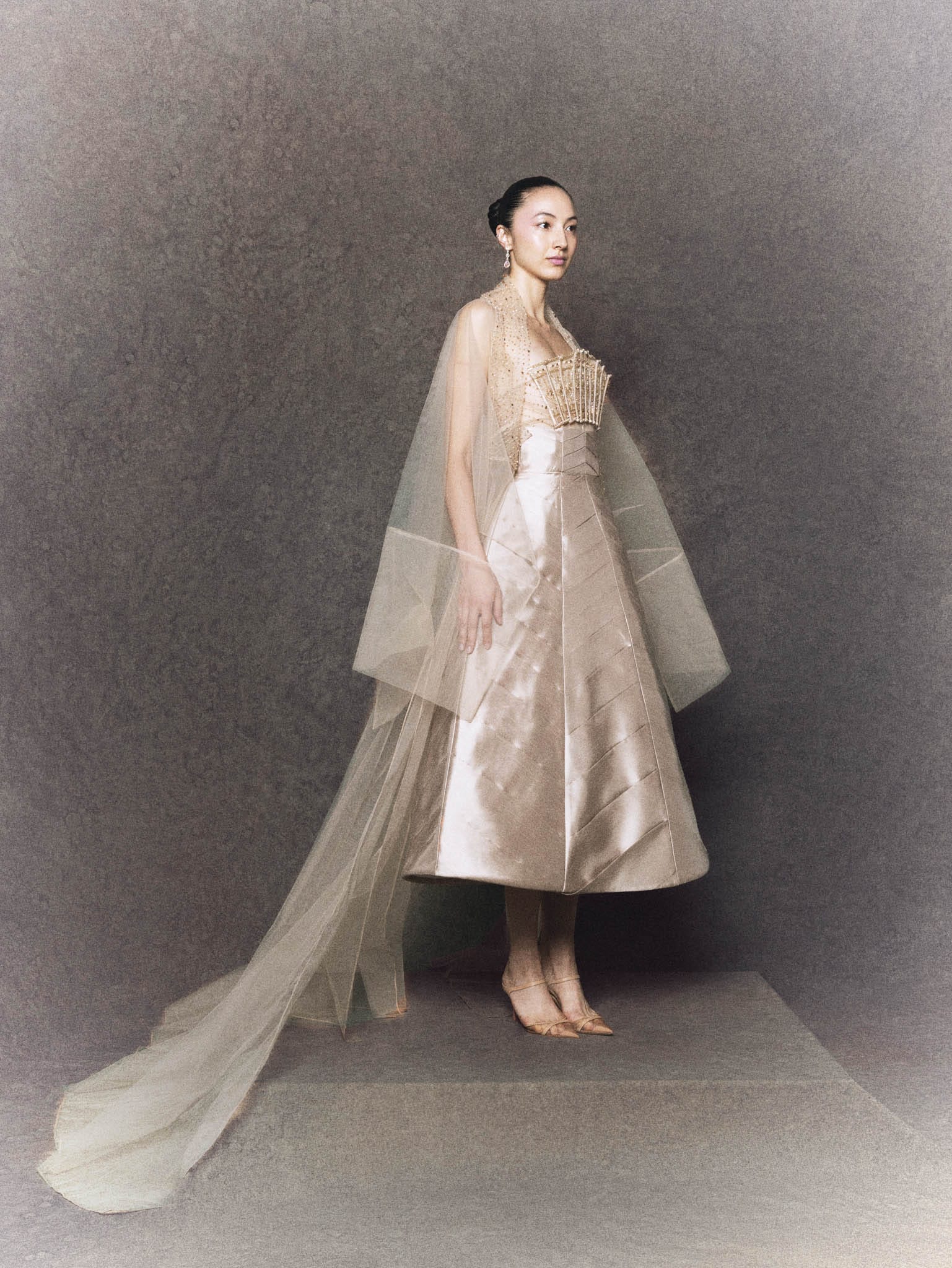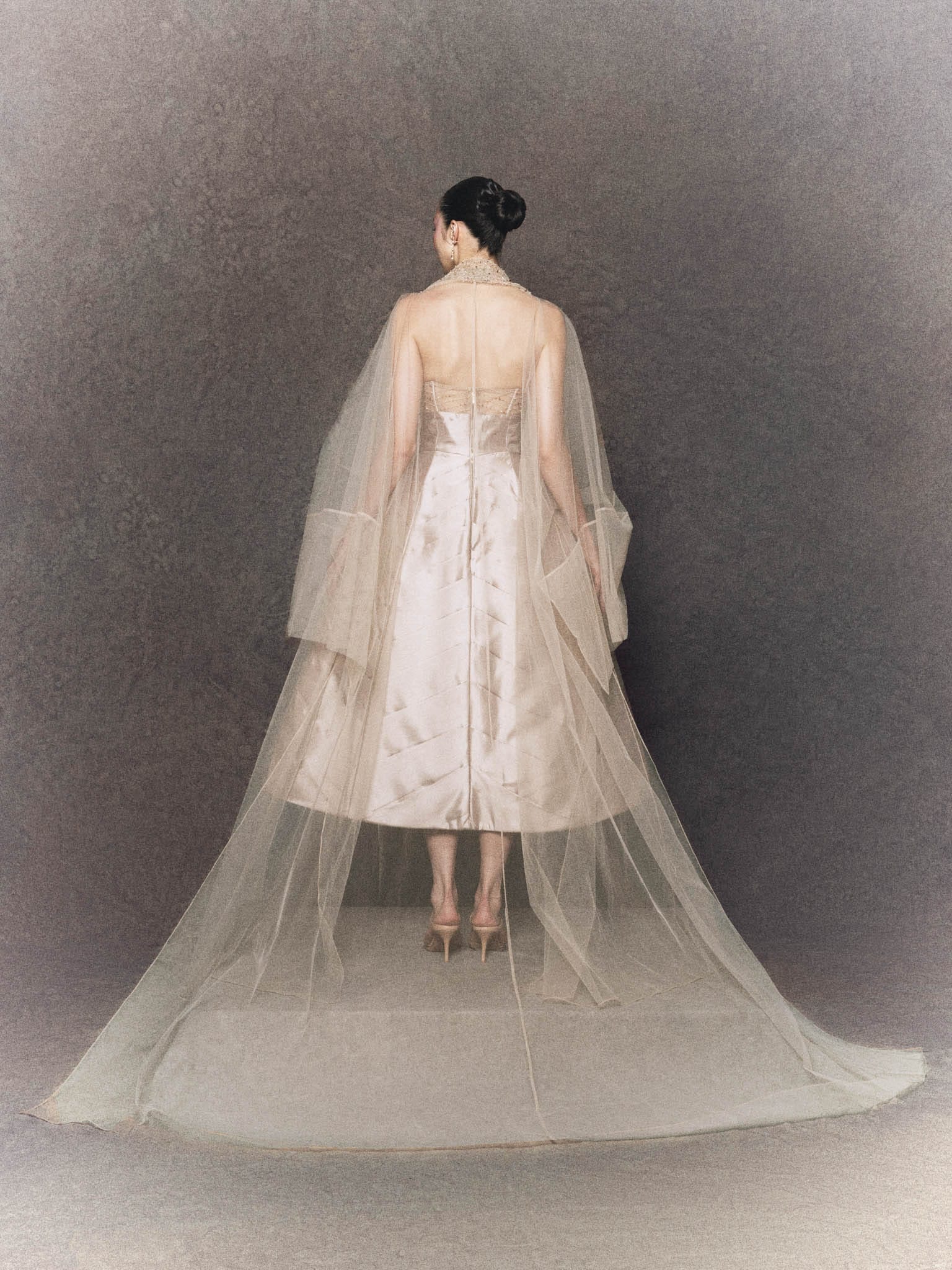 Inspired by the Vietnamese bamboo fan, this champagne midi dress features soft diagonal pleats that open like a gentle breeze. The crystal-embellished bodice adds subtle radiance, while a sheer cape drapes over the shoulders. A refined collar detail recalls the traditional Nhật Bình costume, blending heritage and modern grace.