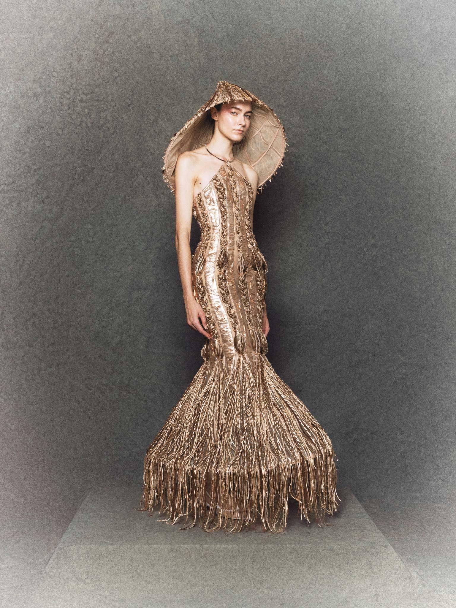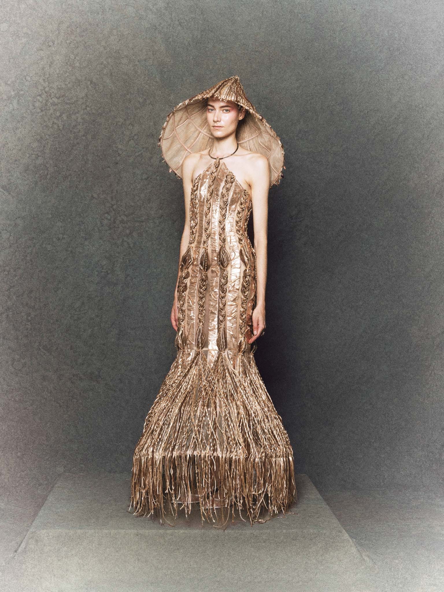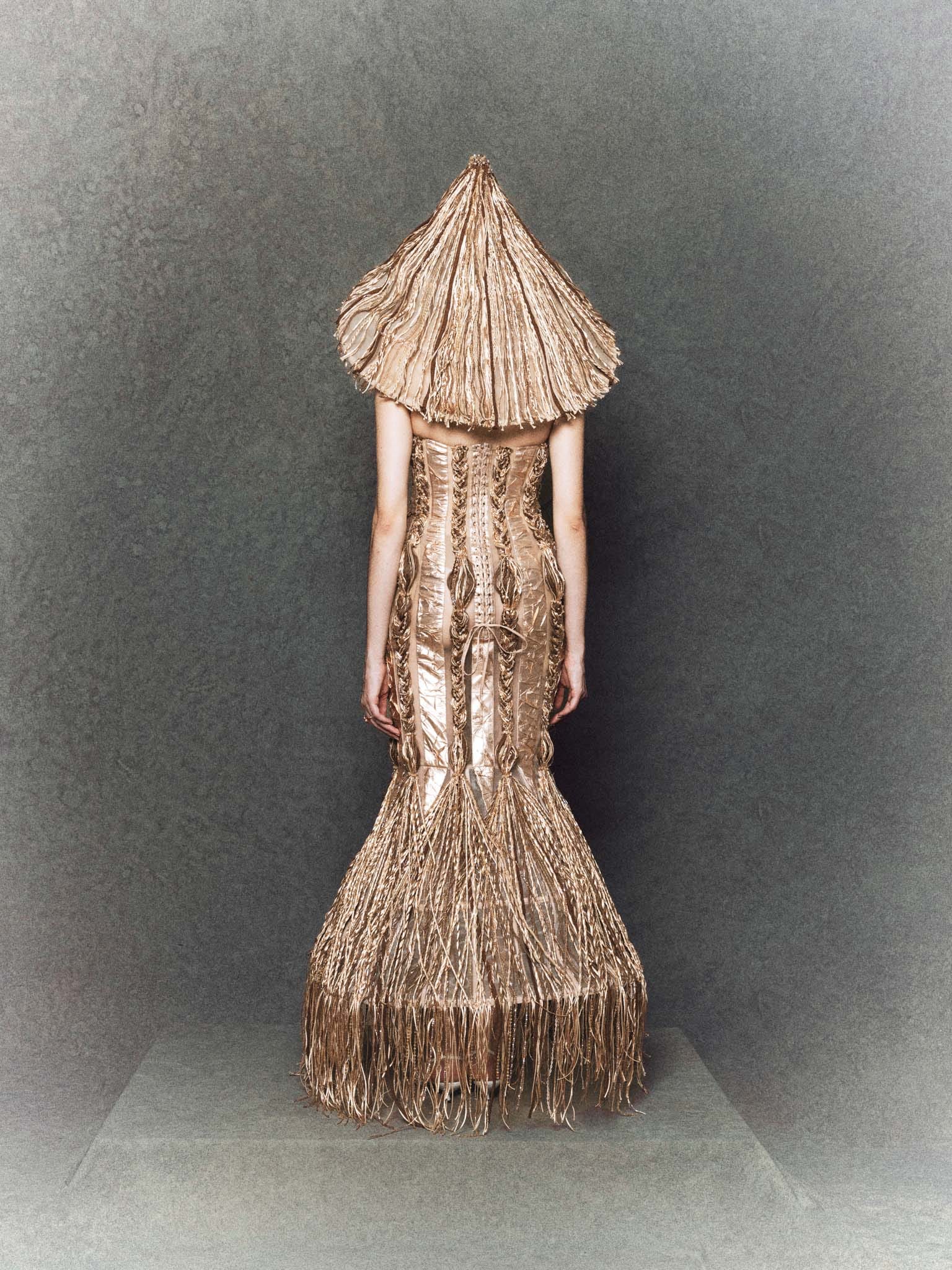 The gown features a halter neckline inspired by the traditional yếm, rendered in golden yellow and earthy brown tones. Its organza base is treated with pressing and heat-molding techniques to create a raw, organic texture. Straw-like details are hand-braided from thousands of threads, beads, and crystals, running vertically to emphasize structure and flow. Completing the look is a sculptural reinterpretation of the “nón lá”, crafted with intricate cord-knotting and reflective accents.