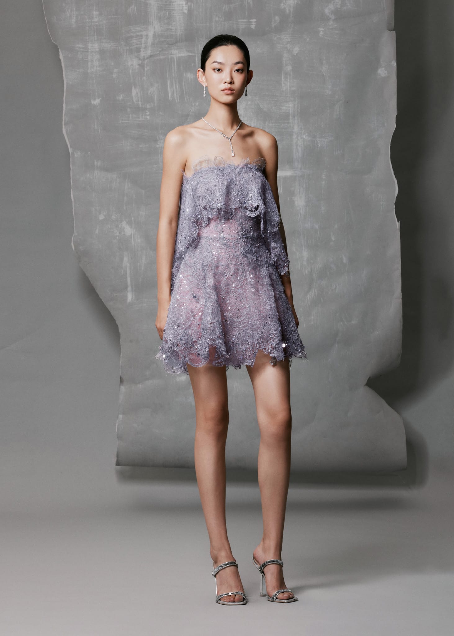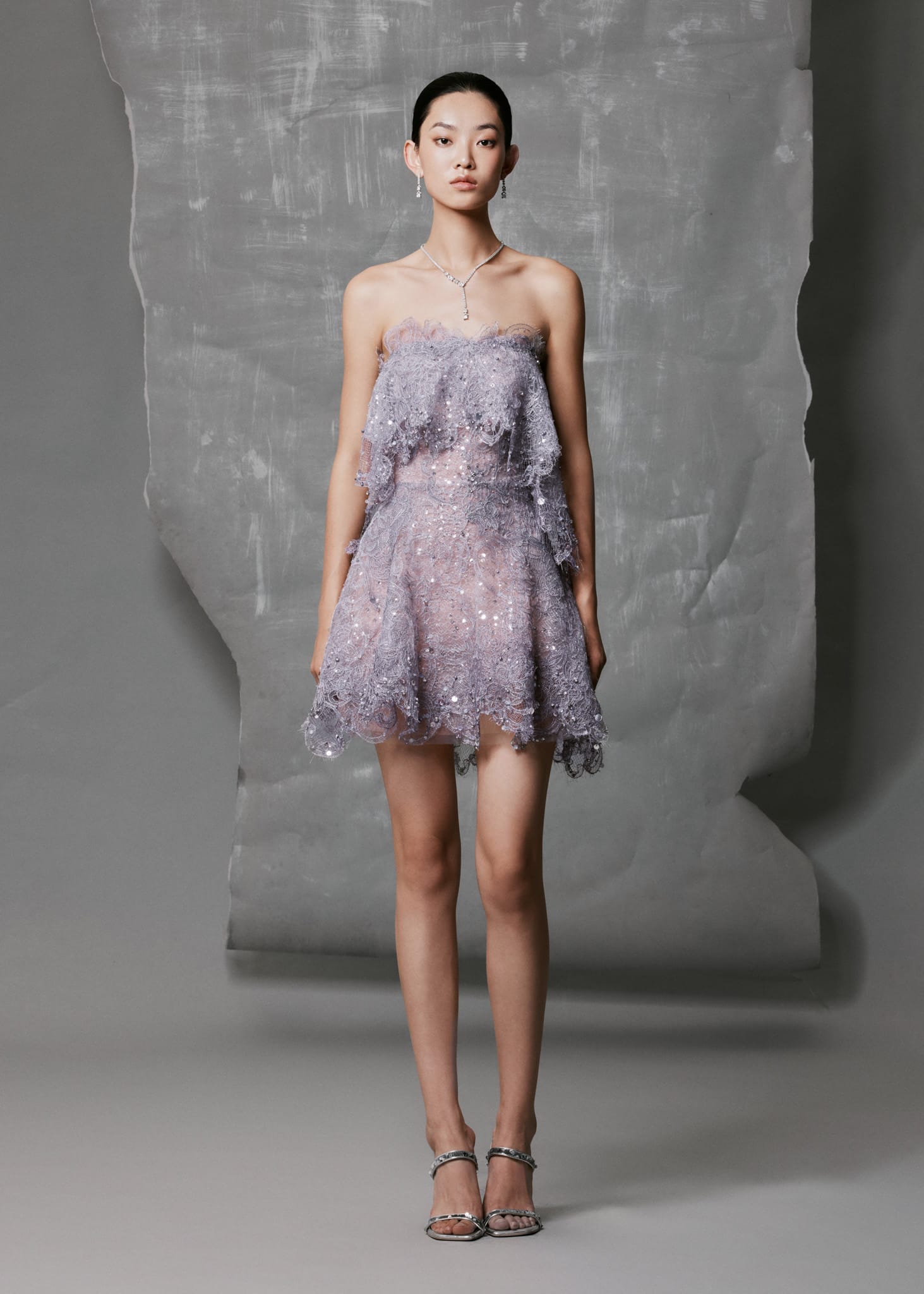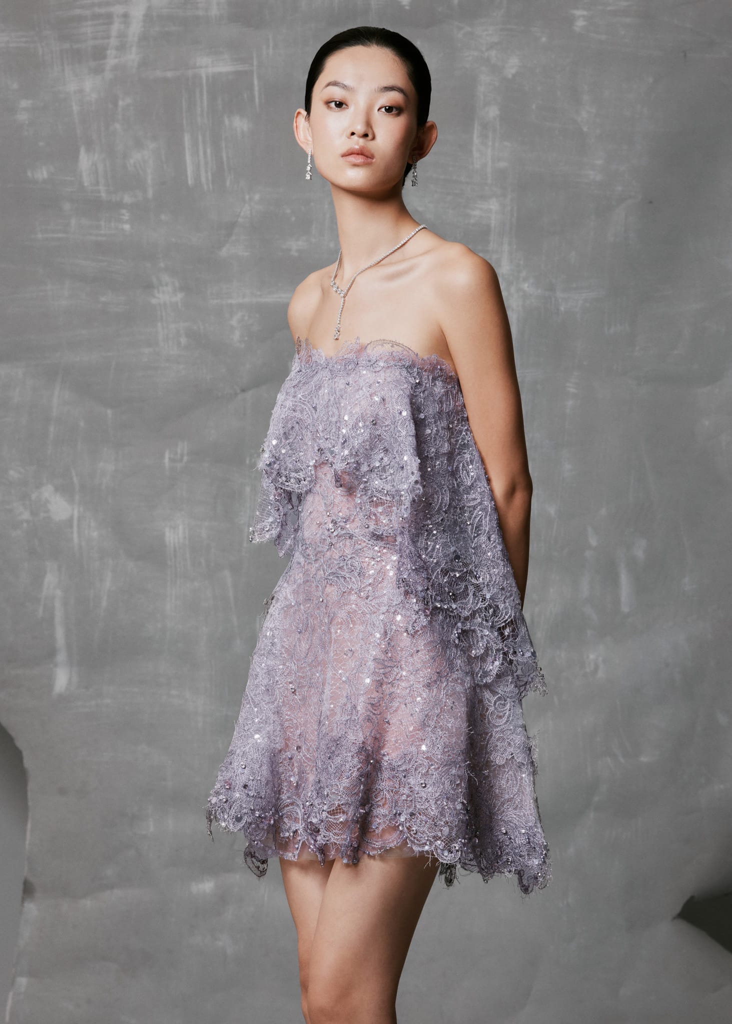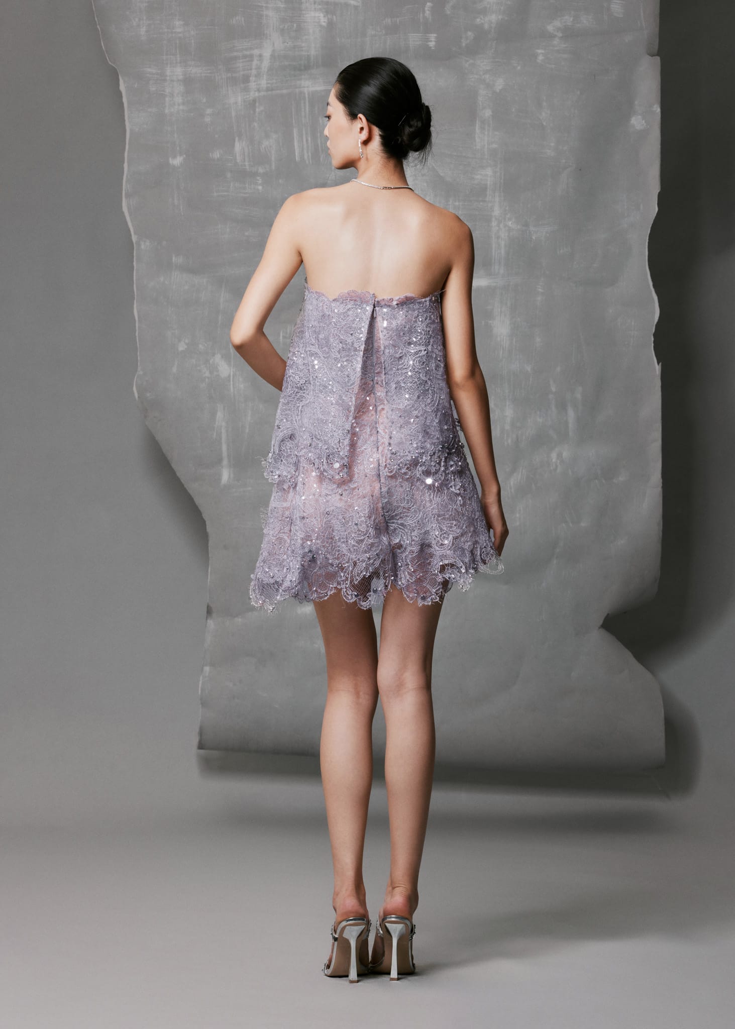 This lavender lace mini dress mirrors the same shimmering elegance as its gown counterpart, fully hand-embellished with sequins, crystals, and beads for a radiant sparkle with every movement. Layered lace ruffles create a soft, romantic texture, while the light tulle lining enhances comfort and gentle volume. With its youthful silhouette and luminous finish, this mini dress is perfect for modern soirées, cocktail events, and refined evening occasions.