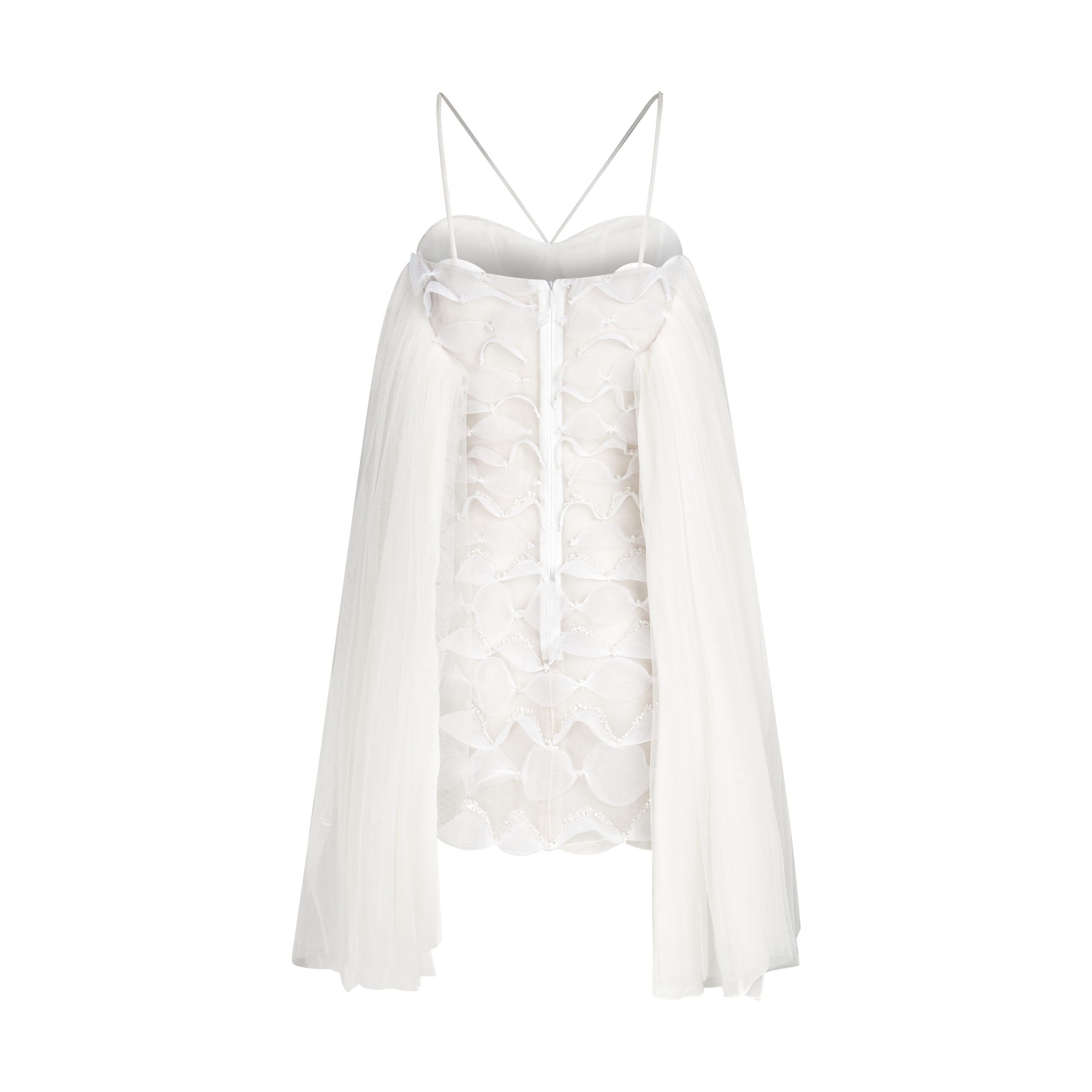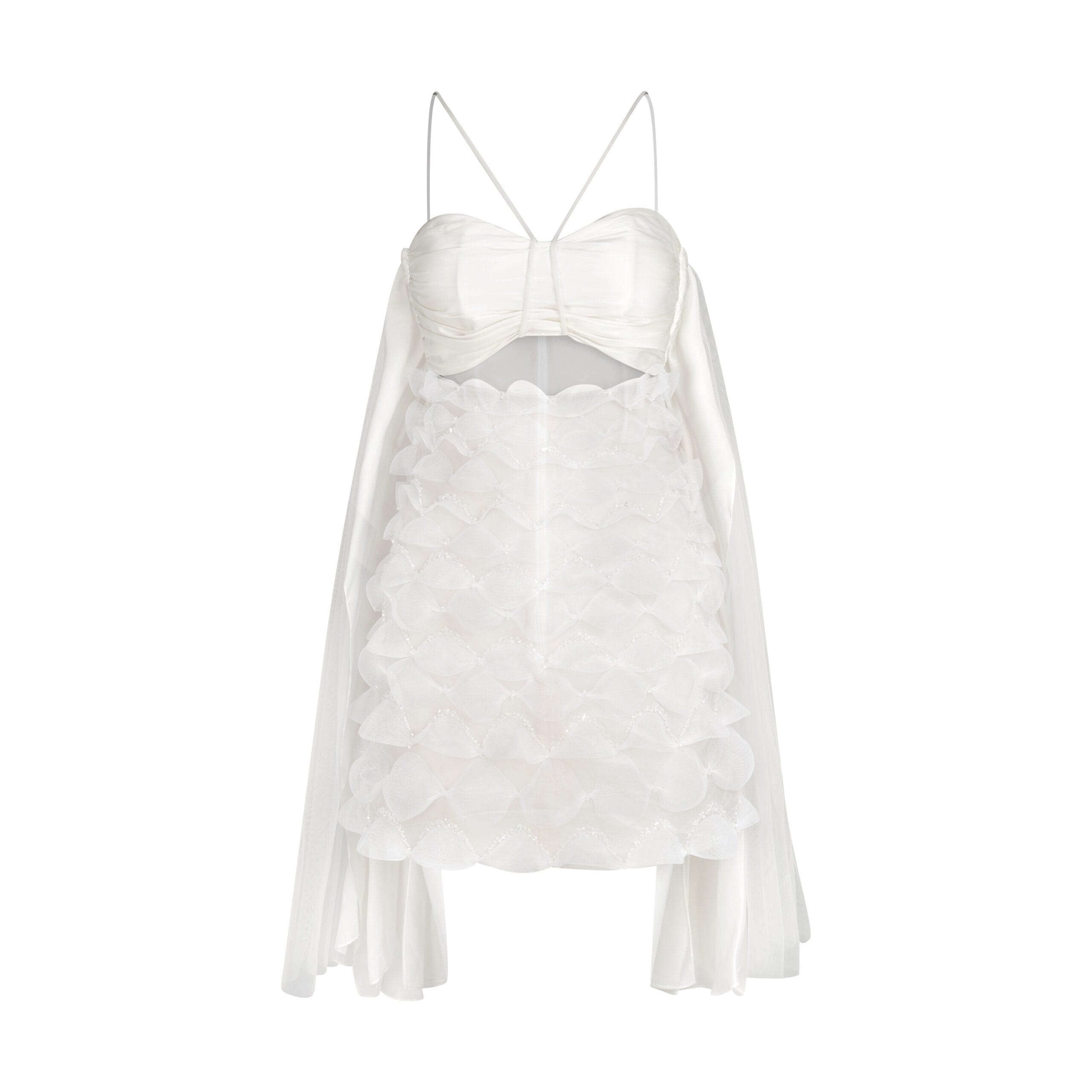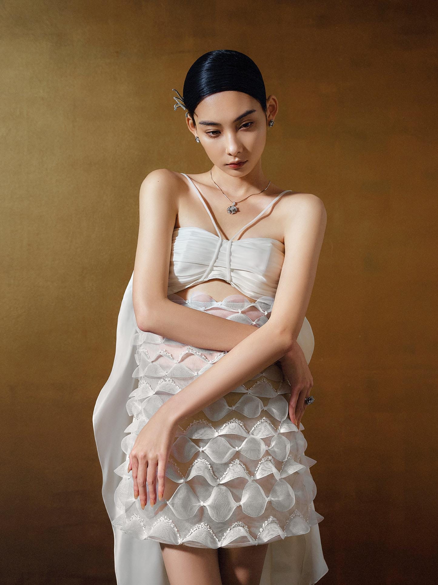 This short white dress captures the tranquility of the Tam Giang Lagoon with a modern, minimalist design. The structured silhouette highlights sophistication, while the clean white fabric embodies purity and elegance. Perfect for cocktail events or daytime soirées, this design reflects understated luxury with a contemporary edge, making it a versatile yet standout piece in any wardrobe.