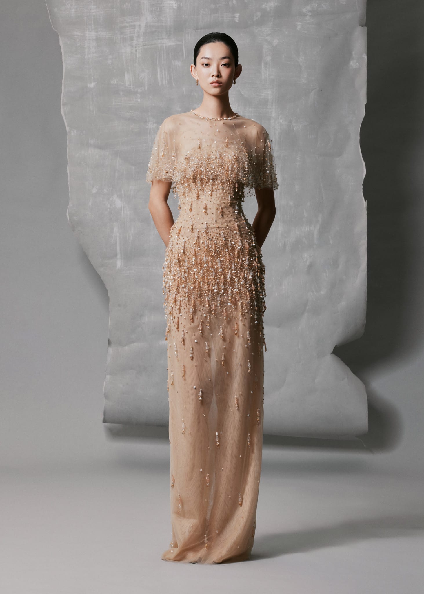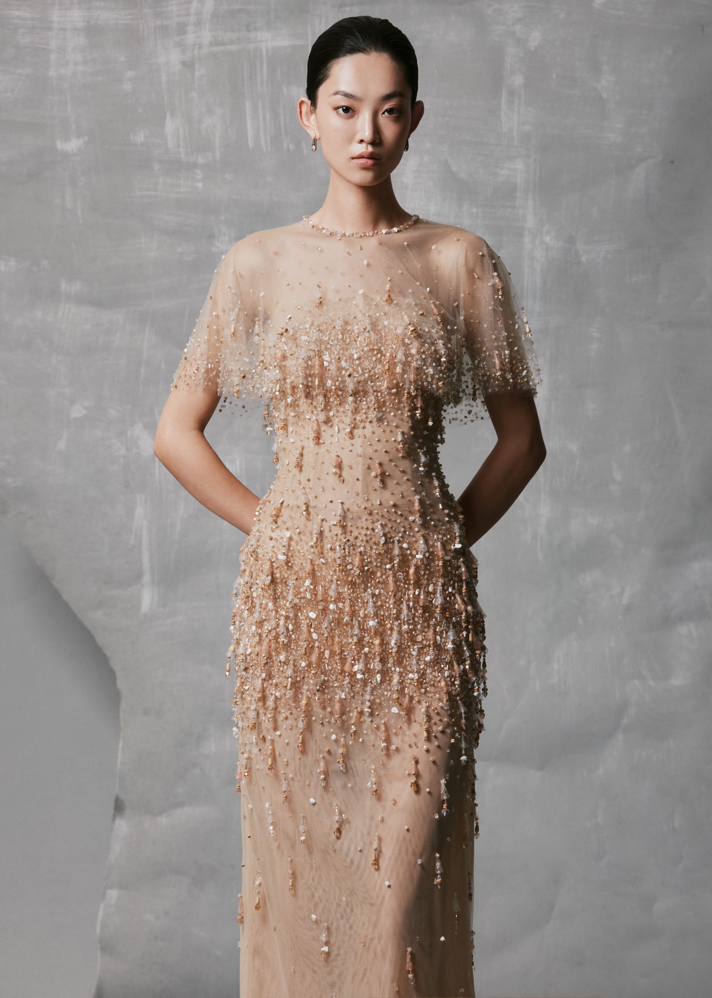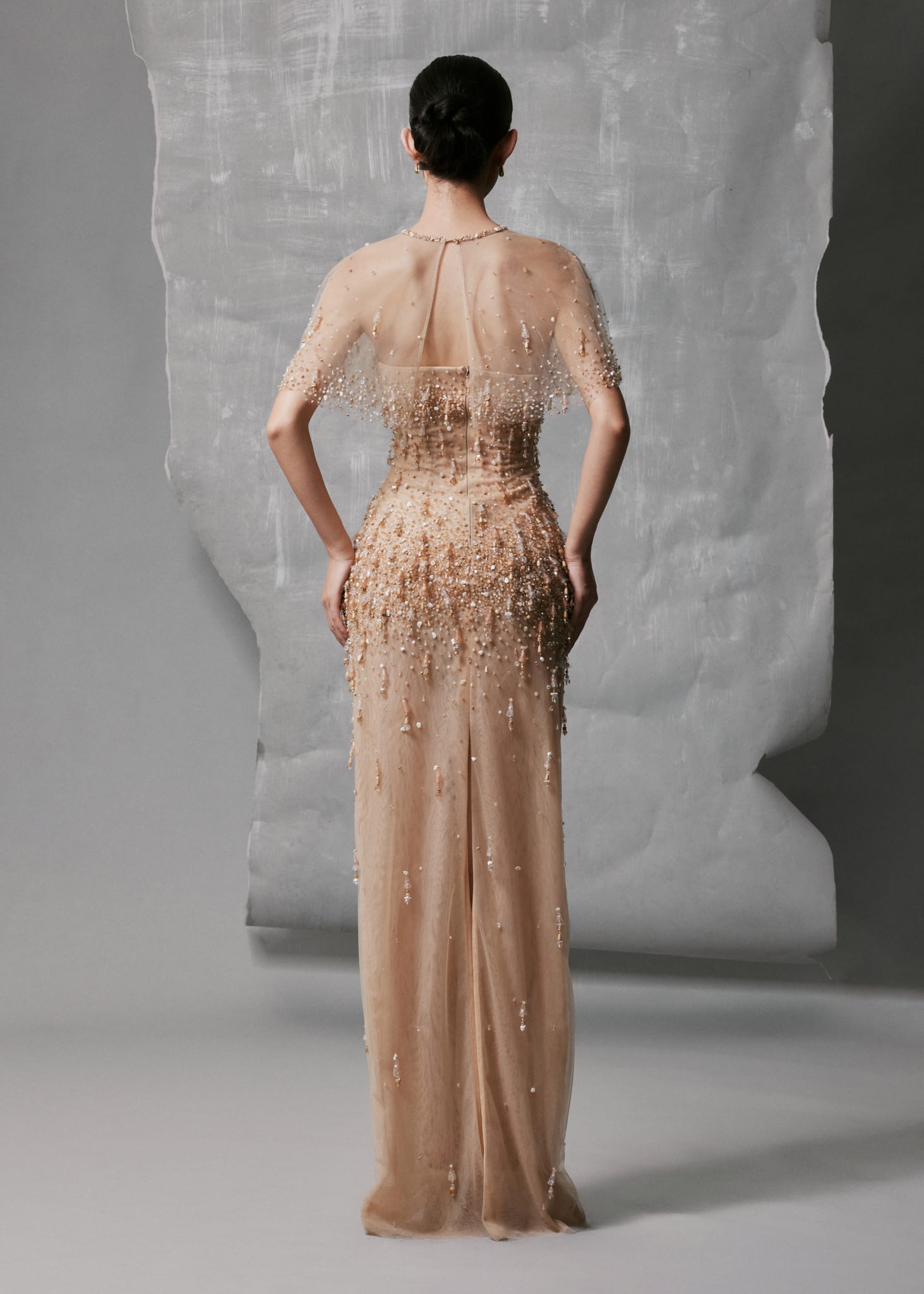 This Nude Mesh Gown is crafted from delicate mesh and hand-embroidered with crystal drops cascading from the bodice to the hem, creating a luminous, liquid-like shimmer. The gown includes a detachable sheer cape in matching nude tone, adding ethereal volume and fluid movement. Its straight column silhouette and refined round neckline balance elegance and simplicity, making it perfect for evening events or special occasions.