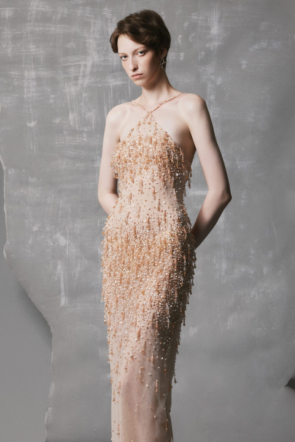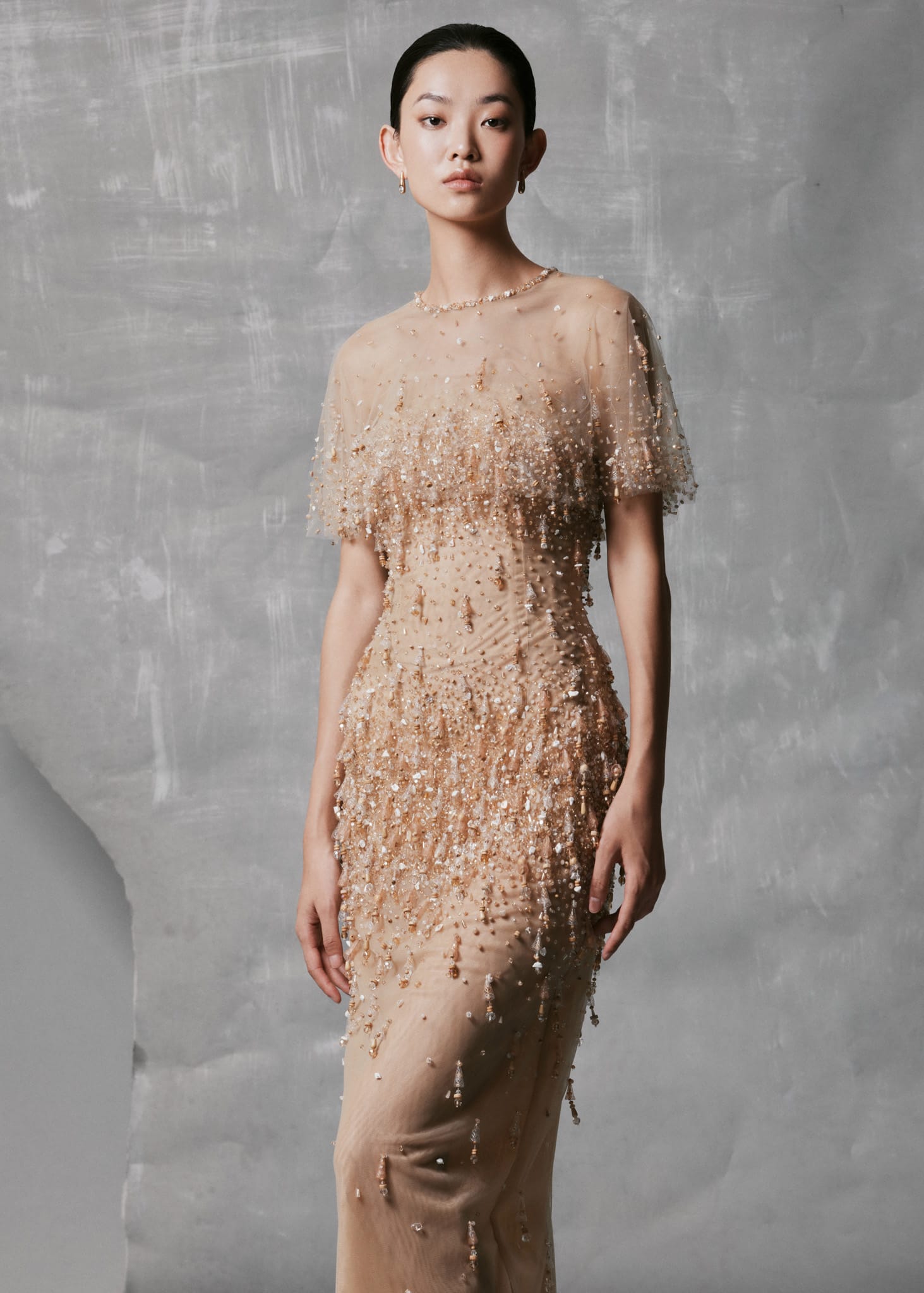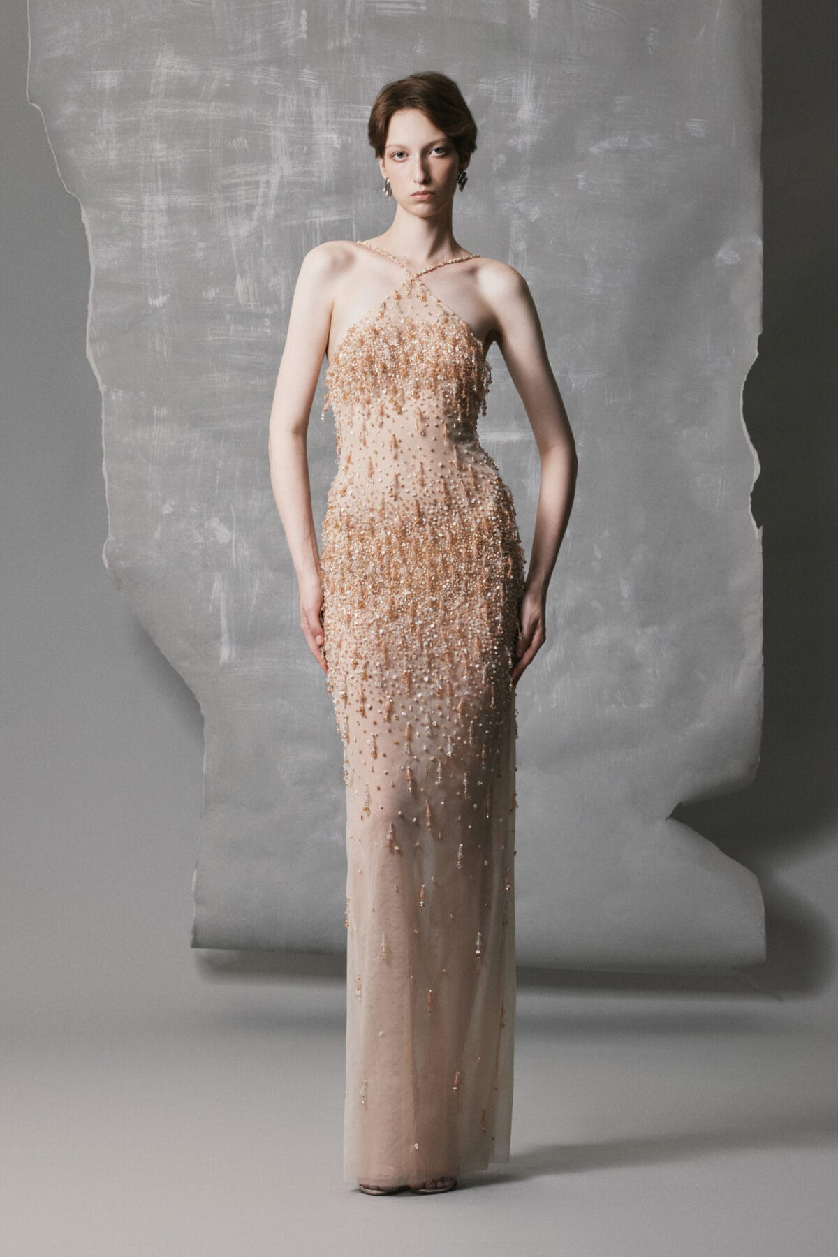 This Nude Mesh Gown is crafted from delicate mesh and hand-embroidered with crystal drops cascading from the bodice to the hem, creating a luminous, liquid-like shimmer. The gown includes a detachable sheer cape in matching nude tone, adding ethereal volume and fluid movement. Its straight column silhouette and refined round neckline balance elegance and simplicity, making it perfect for evening events or special occasions.