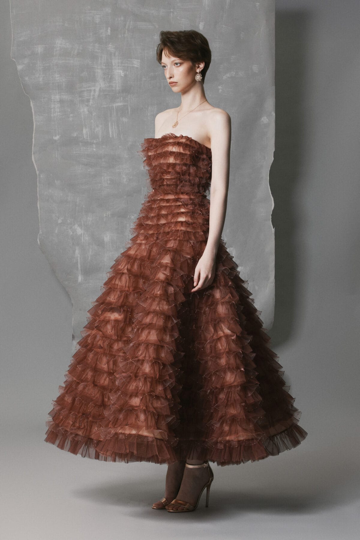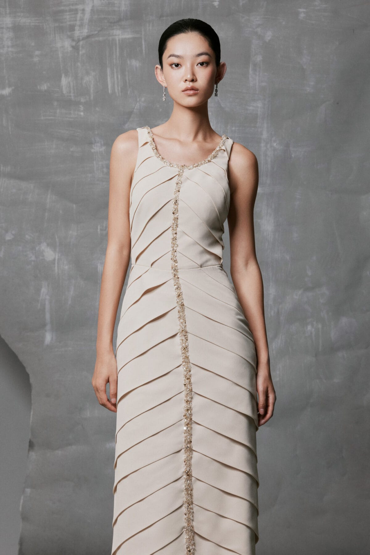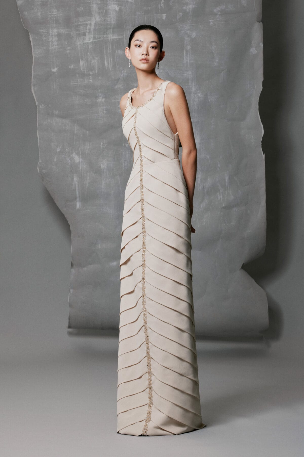 • Design Details: Hand-applied crystal drops for radiant shimmer; detachable sheer cape adds volume and movement; refined round neckline