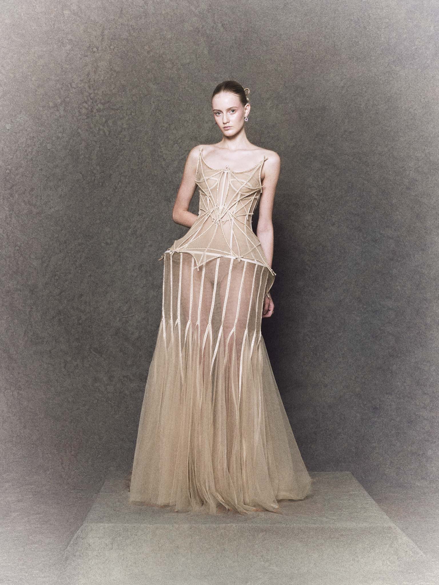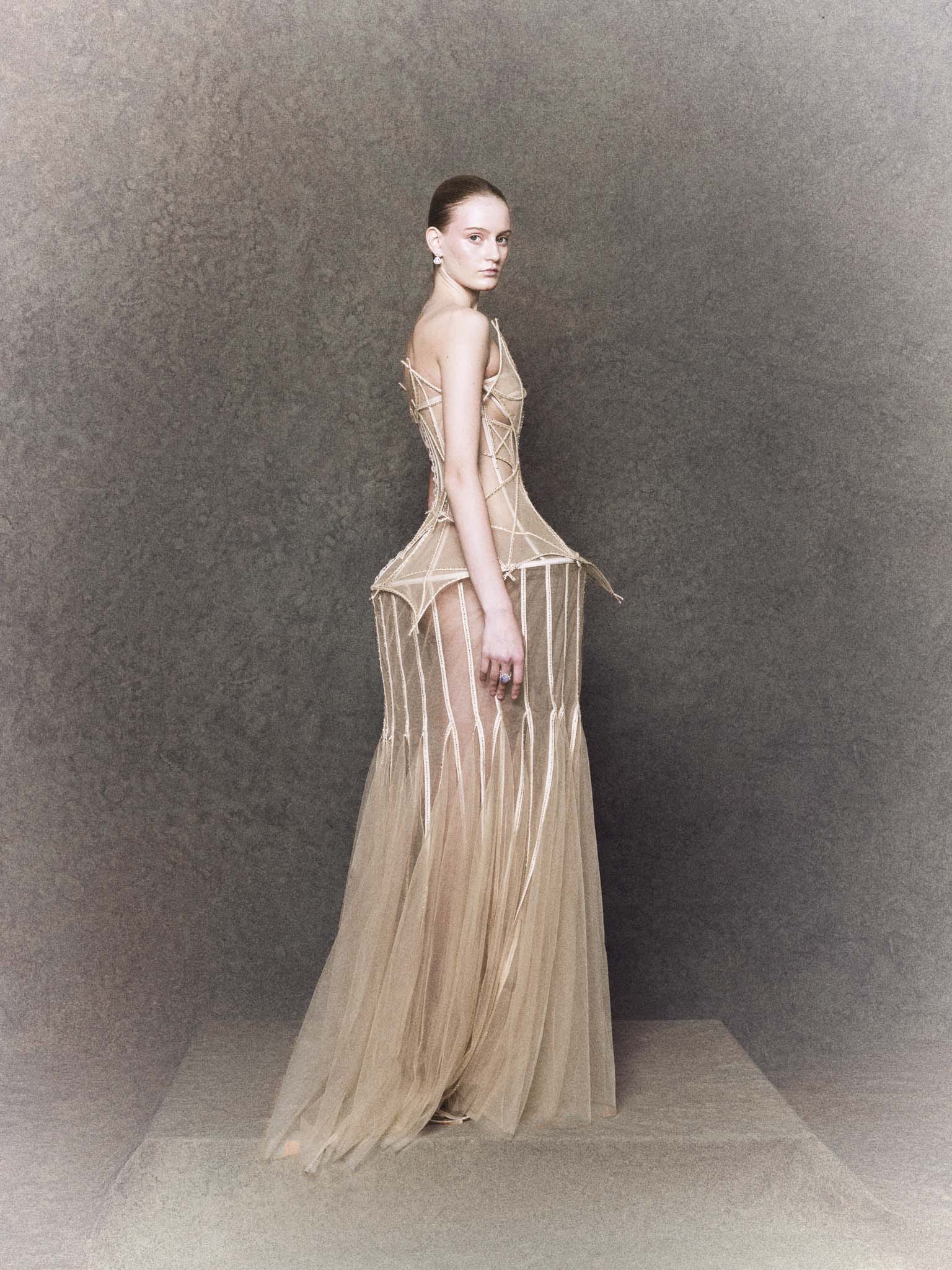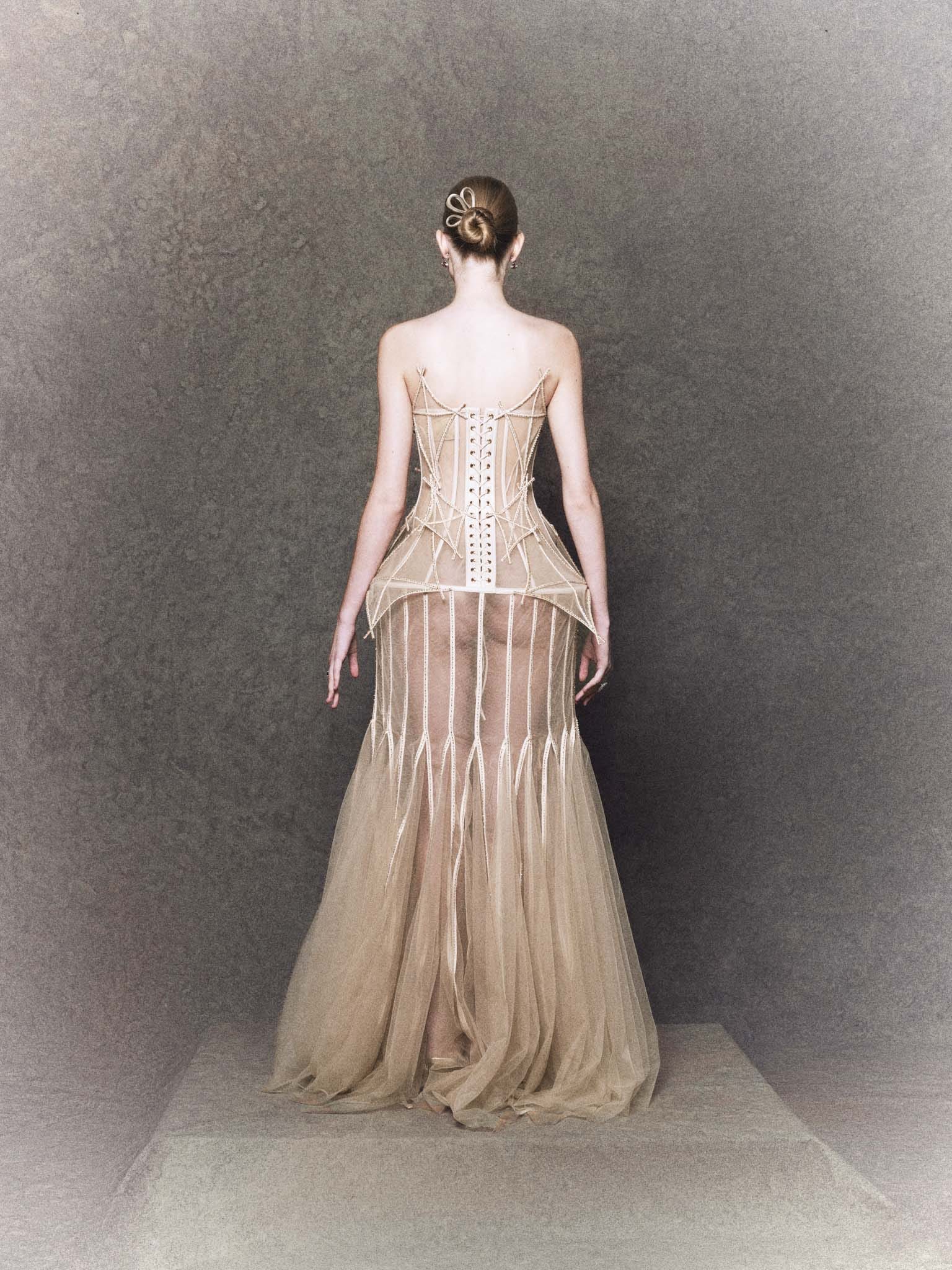 Evoking the gentle dreams of childhood, this nude mesh gown features a sculpted kite-inspired motif across the bodice, hand-embellished with glistening crystals. A soft peplum detail flutters like a tail in the wind, capturing the lightness of memory and motion in every fold.