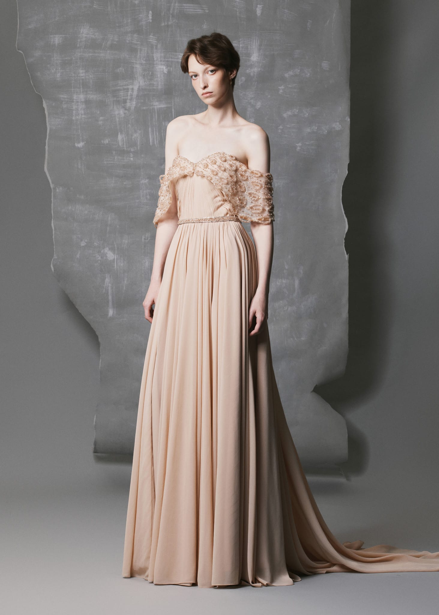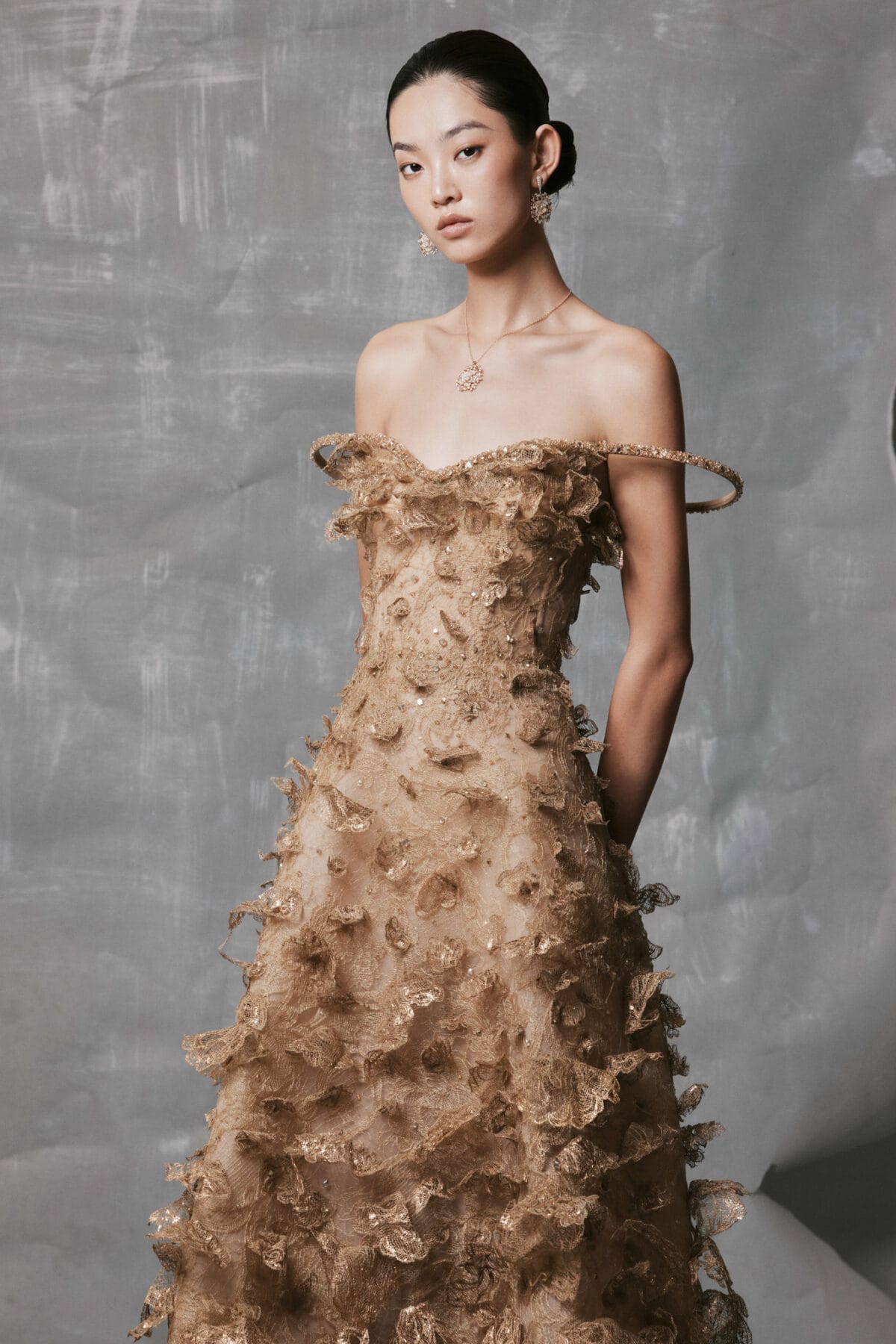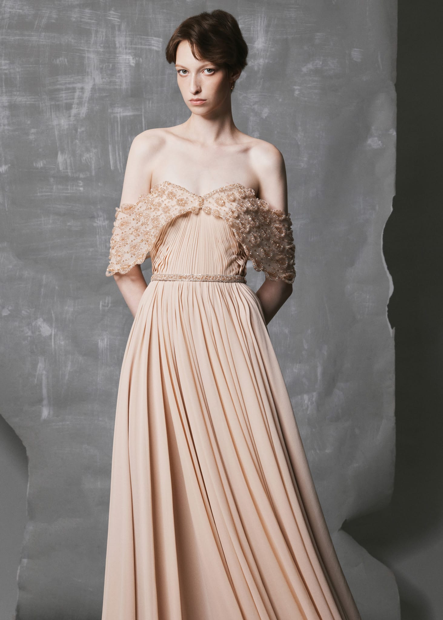 - Design Details: Hand-shaped horsehair and crystal drop motifs on off-shoulder sleeves; gathered chiffon skirt for soft volume; slim belt adds proportion and sparkle