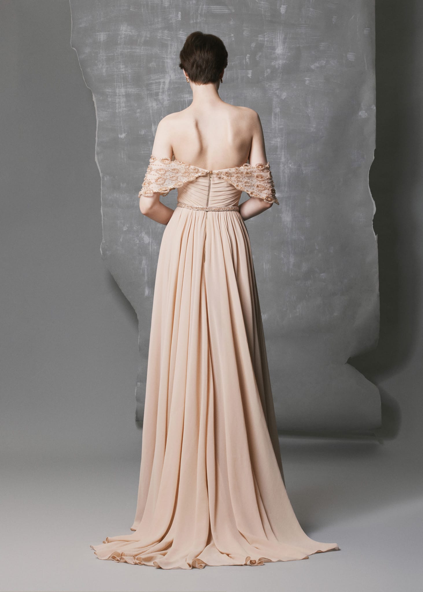 This Off-Shoulder Nude Chiffon Gown embodies softness and luminosity with hand-shaped crystal drop motifs draping over the shoulders and upper bodice. The flowing chiffon skirt adds gentle movement, while the slim crystal-accented belt defines the waist, creating a refined, elegant silhouette ideal for evening events or formal occasions.