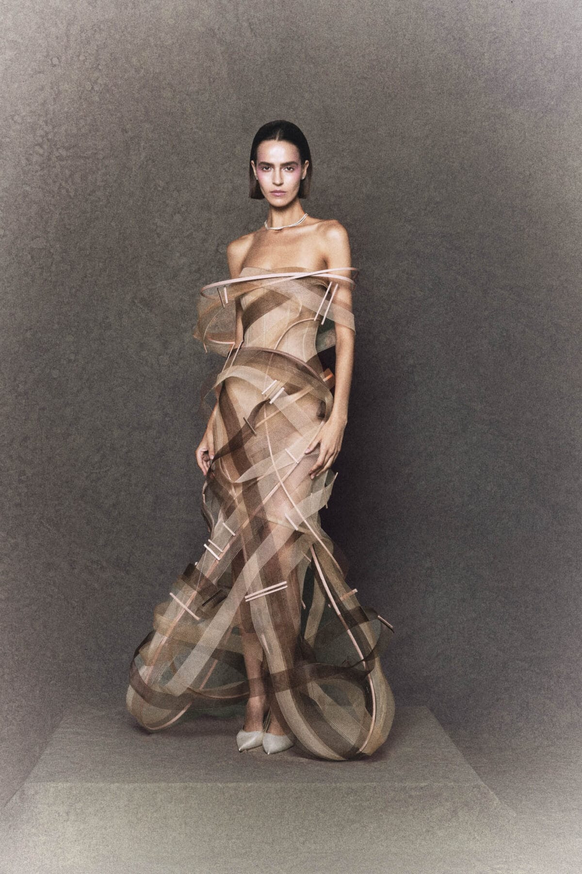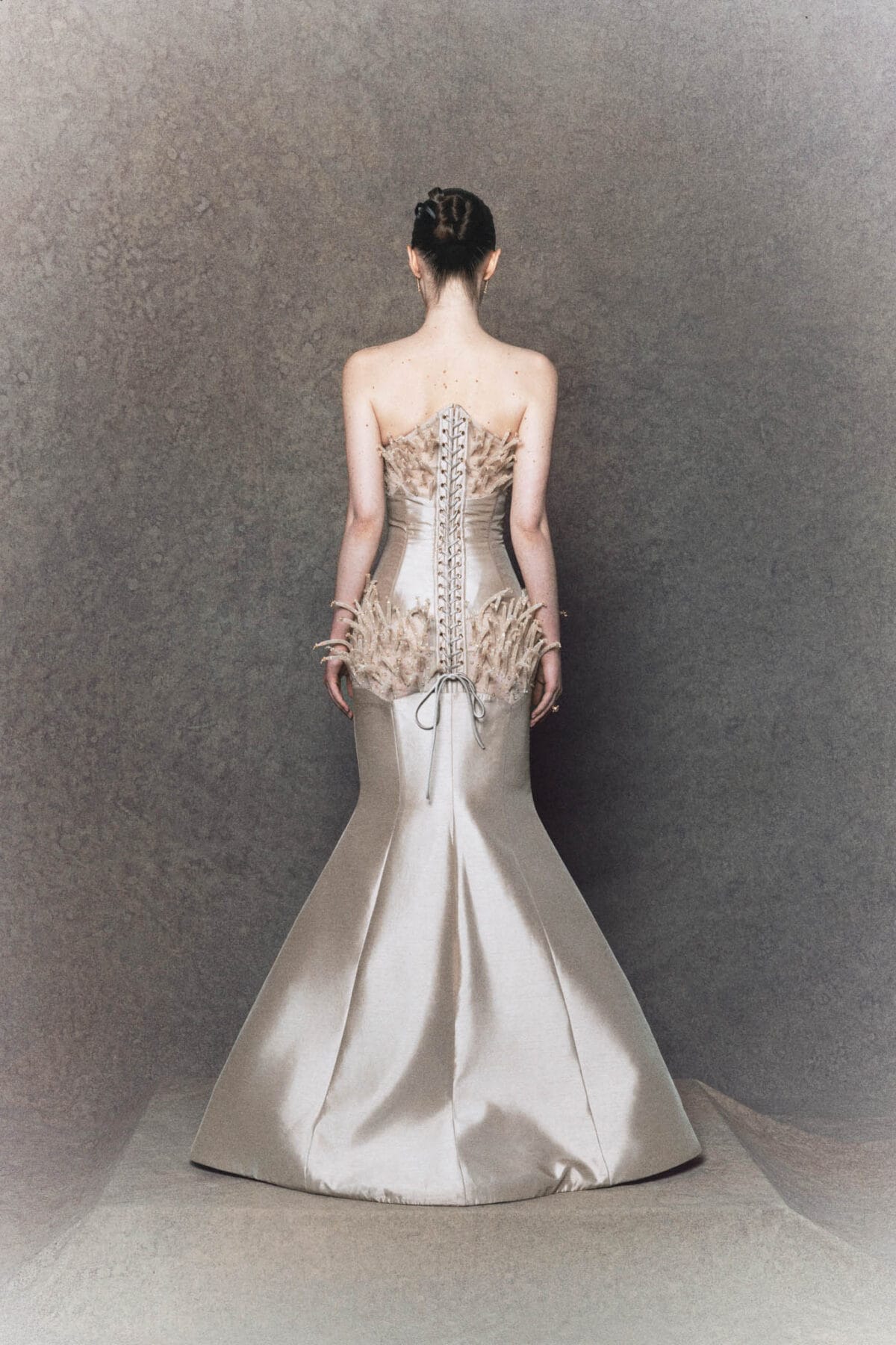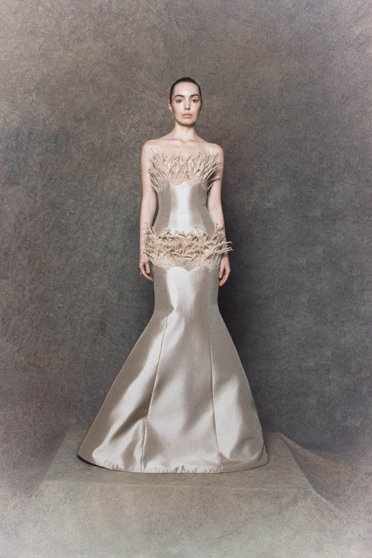 Strapless A-line gown golden-bronze silk draws inspiration from the traditional Vietnamese “ao dai”. The fitted bodice flows into a soft A-line silhouette, complemented by a golden-bronze silk panel symbolizing the long flap of the ao dai, outlined with wooden bead trimmings that extend behind the corset. The multi-layered tulle skirt, crafted from three gradient mesh tones, creates gentle volume and movement. Completed with a matching headpiece inspired by the Vietnamese “khan dong”, this gown embodies elegance, cultural heritage, and modern couture design.