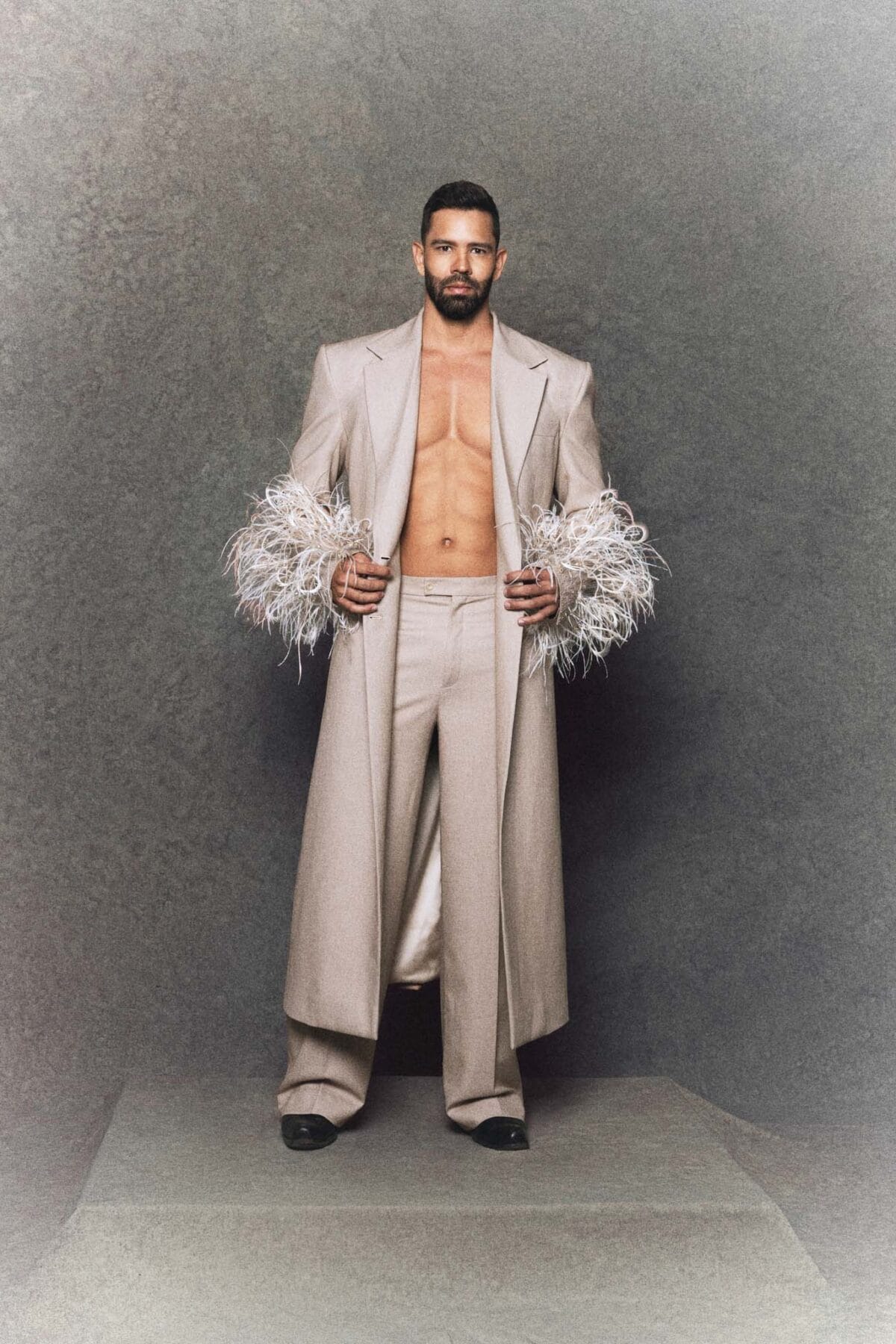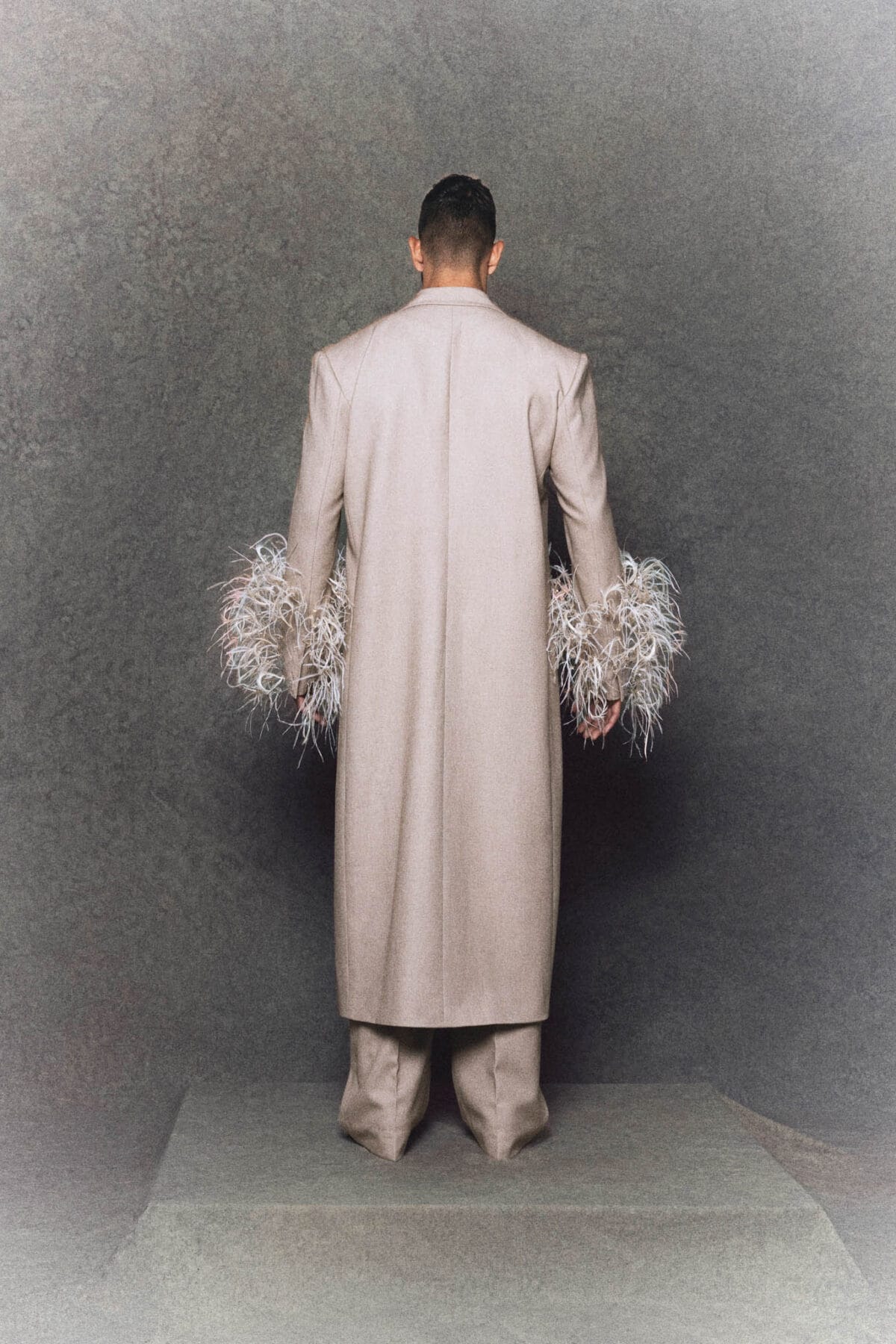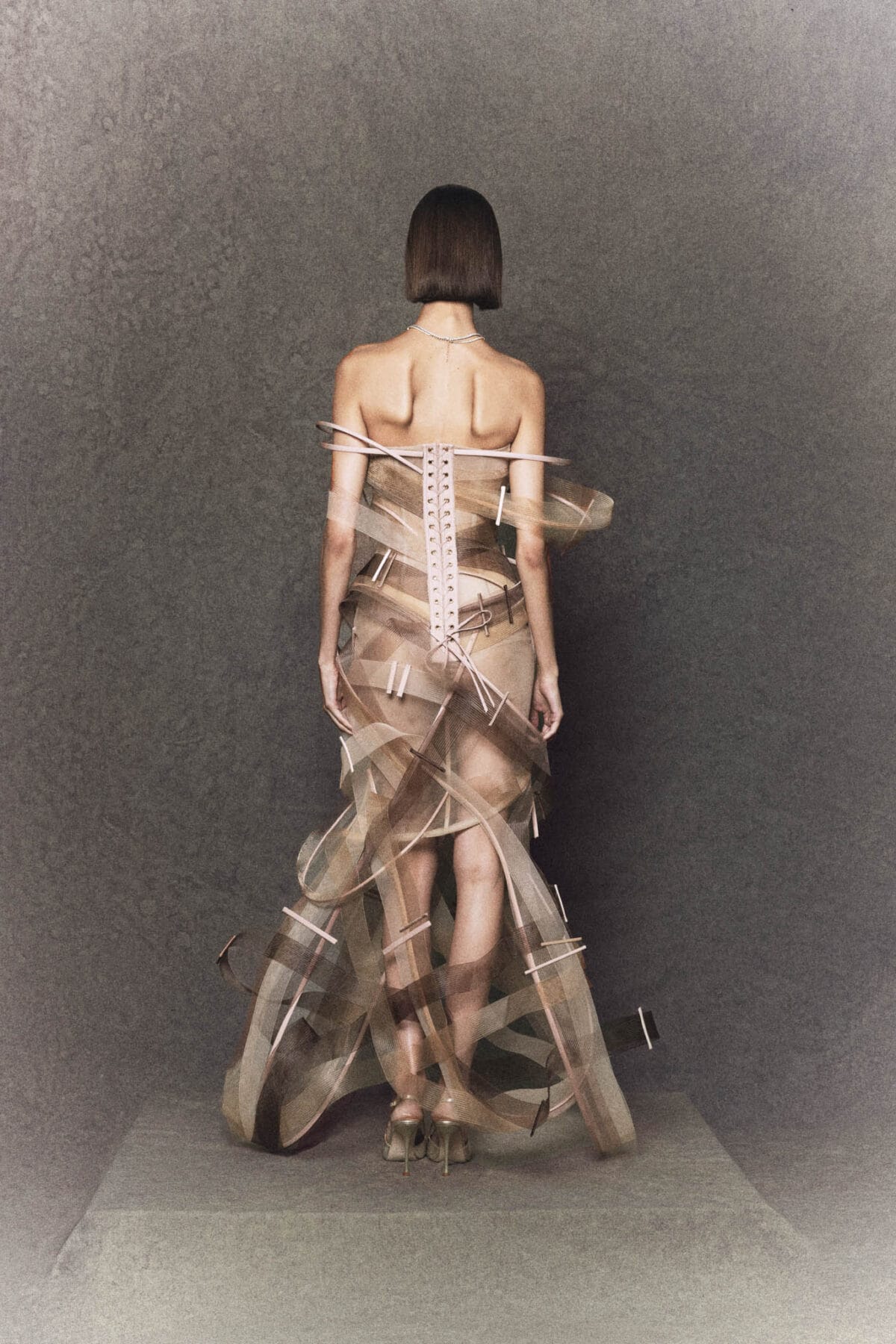 Strapless A-line gown golden-bronze silk draws inspiration from the traditional Vietnamese “ao dai”. The fitted bodice flows into a soft A-line silhouette, complemented by a golden-bronze silk panel symbolizing the long flap of the ao dai, outlined with wooden bead trimmings that extend behind the corset. The multi-layered tulle skirt, crafted from three gradient mesh tones, creates gentle volume and movement. Completed with a matching headpiece inspired by the Vietnamese “khan dong”, this gown embodies elegance, cultural heritage, and modern couture design.