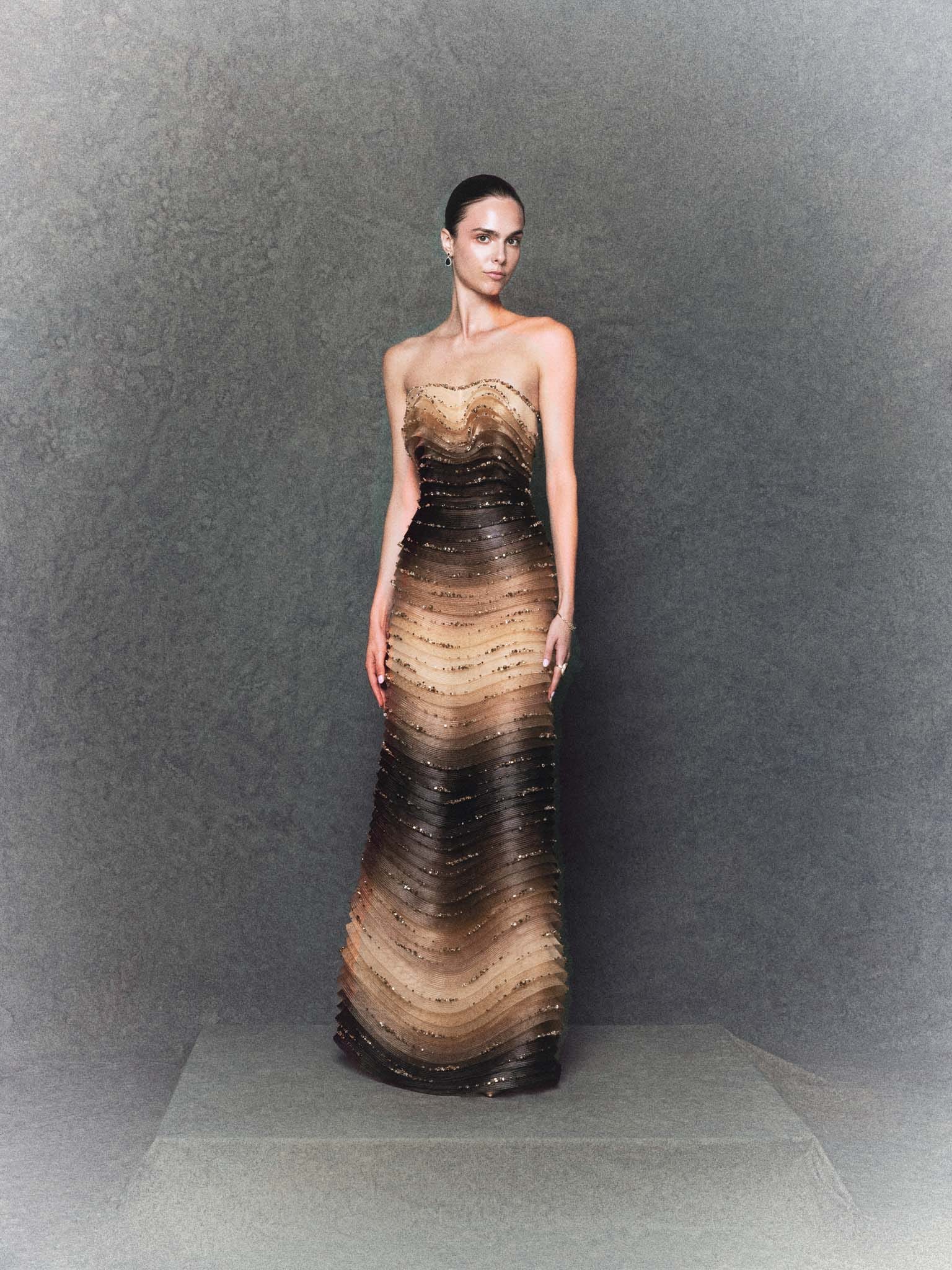 Elevate your evening look with this Strapless Gradient Brown Gown, crafted from stretch mesh that transitions softly from light to deep brown. The straight-cut silhouette is hand-embellished with shimmering crystals and beads, creating a subtle interplay of light and movement across the body.