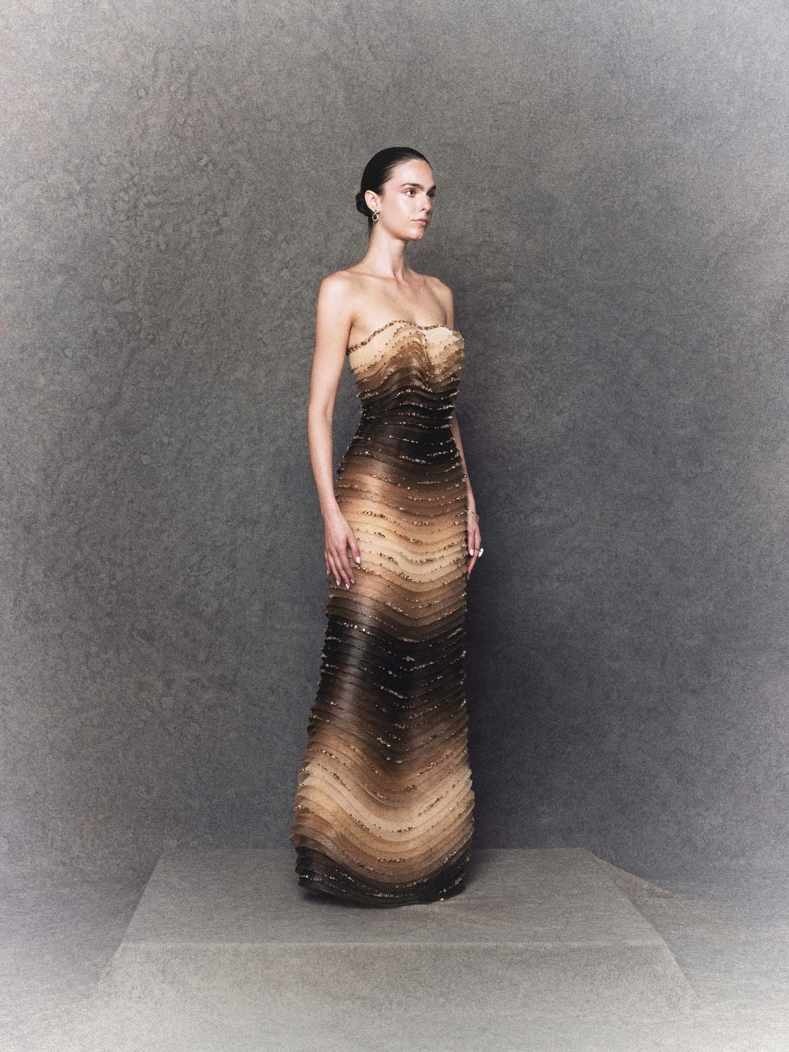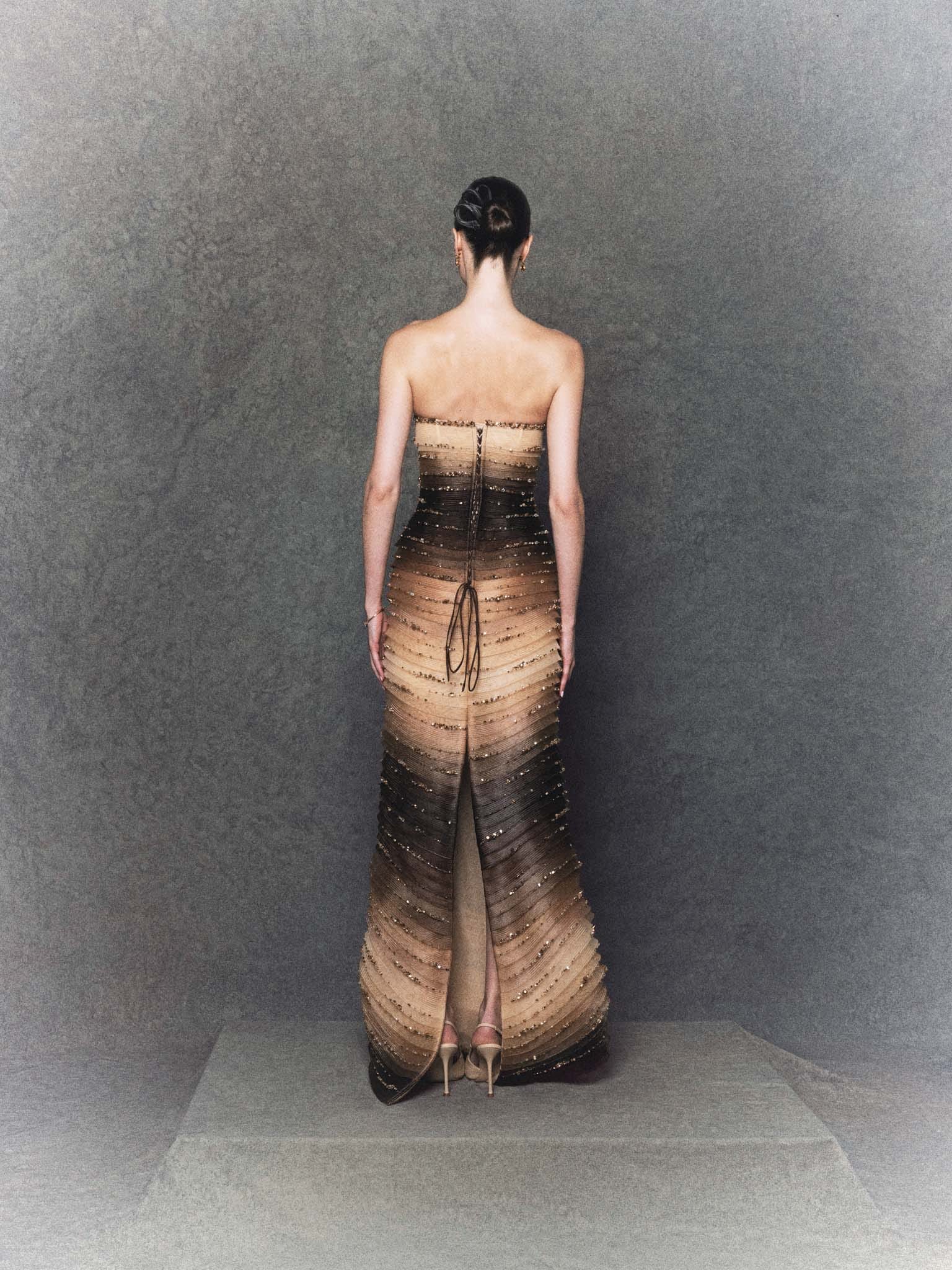 - Strapless straight silhouette in gradient brown stretch mesh