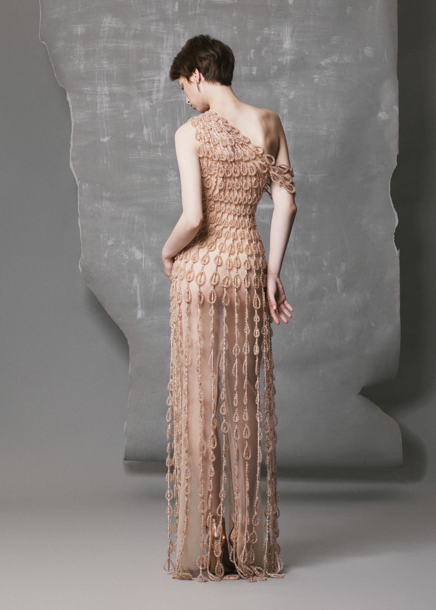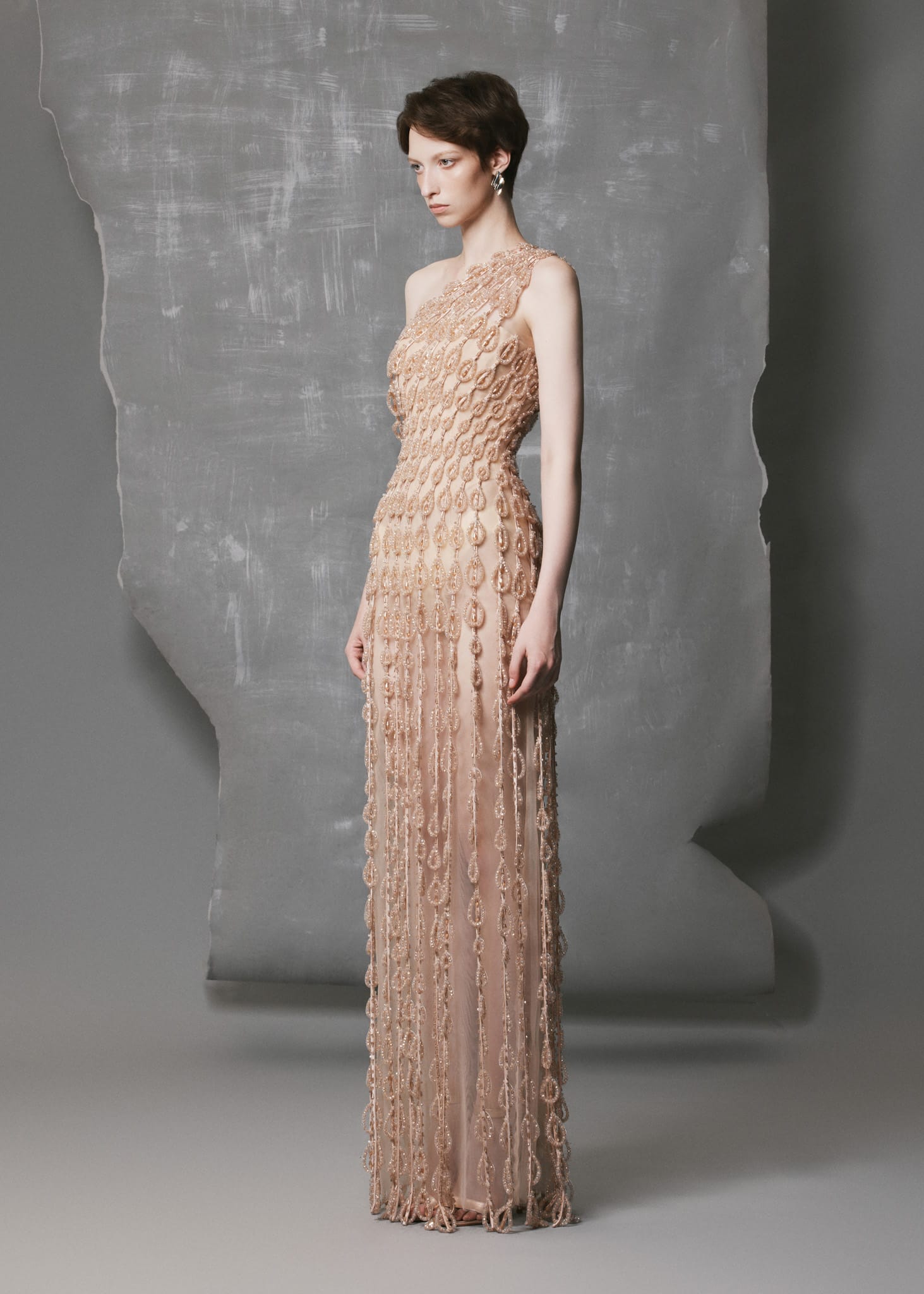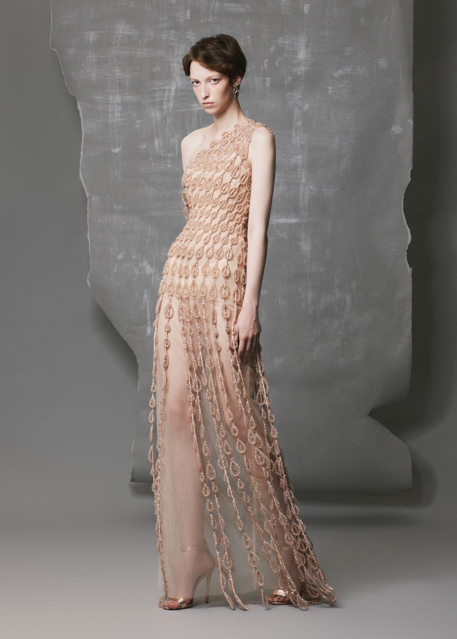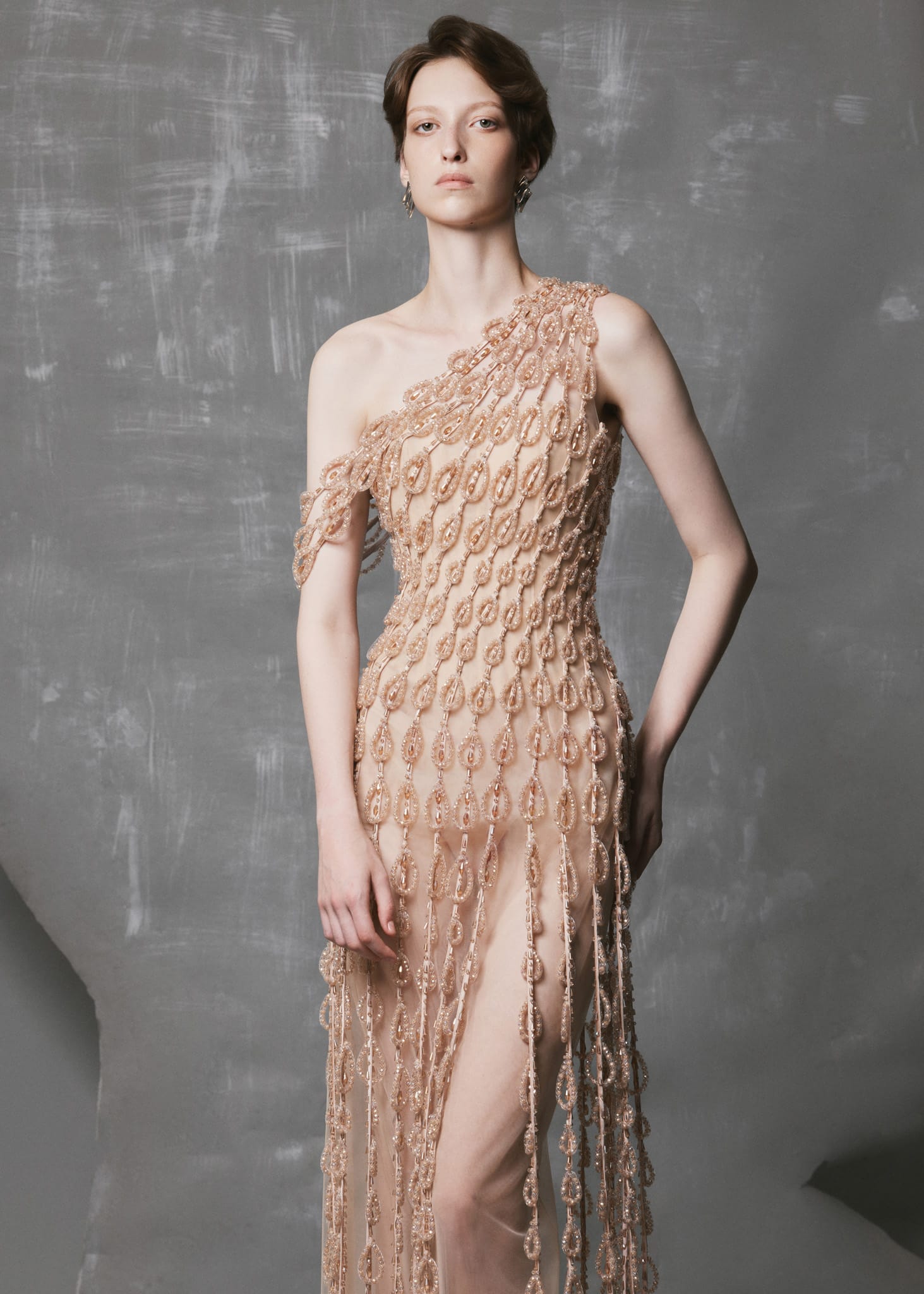 This Strapless Nude Satin Gown showcases exceptional couture craftsmanship with hand-applied crystal and bead motifs cascading from the lower bodice to the hem. The one-shoulder neckline accentuates natural lines, while the double-faced satin provides a refined drape and luminous shine. The front slit and nude mesh lining ensure fluid movement, comfort, and subtle transparency, making it perfect for evening events or formal occasions.