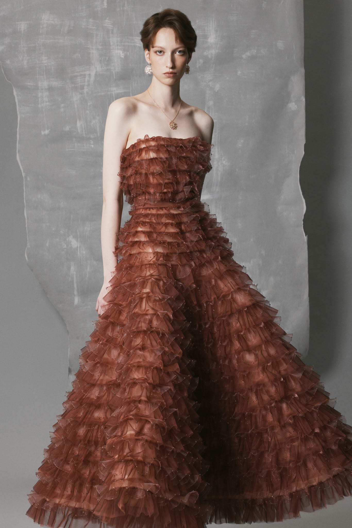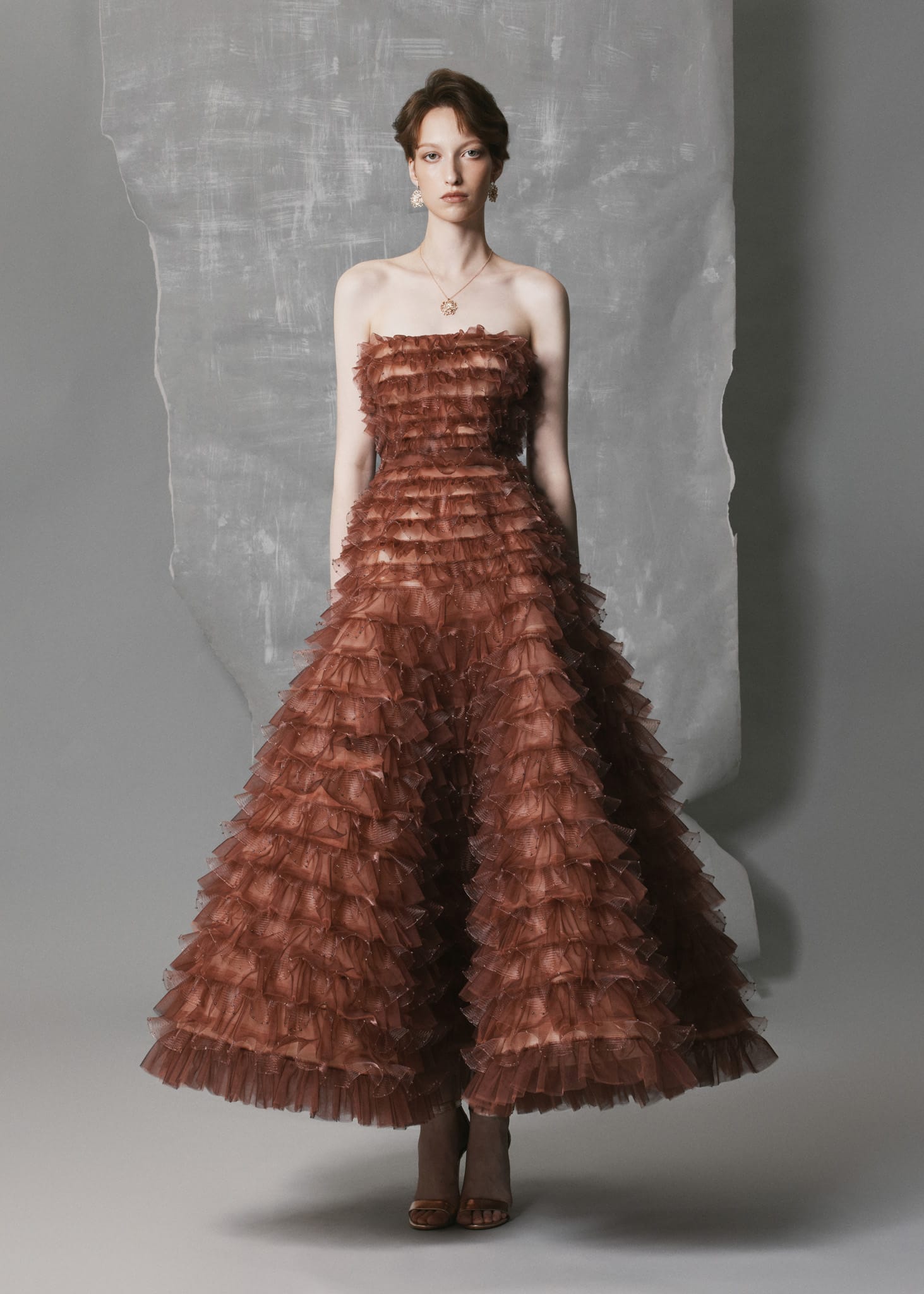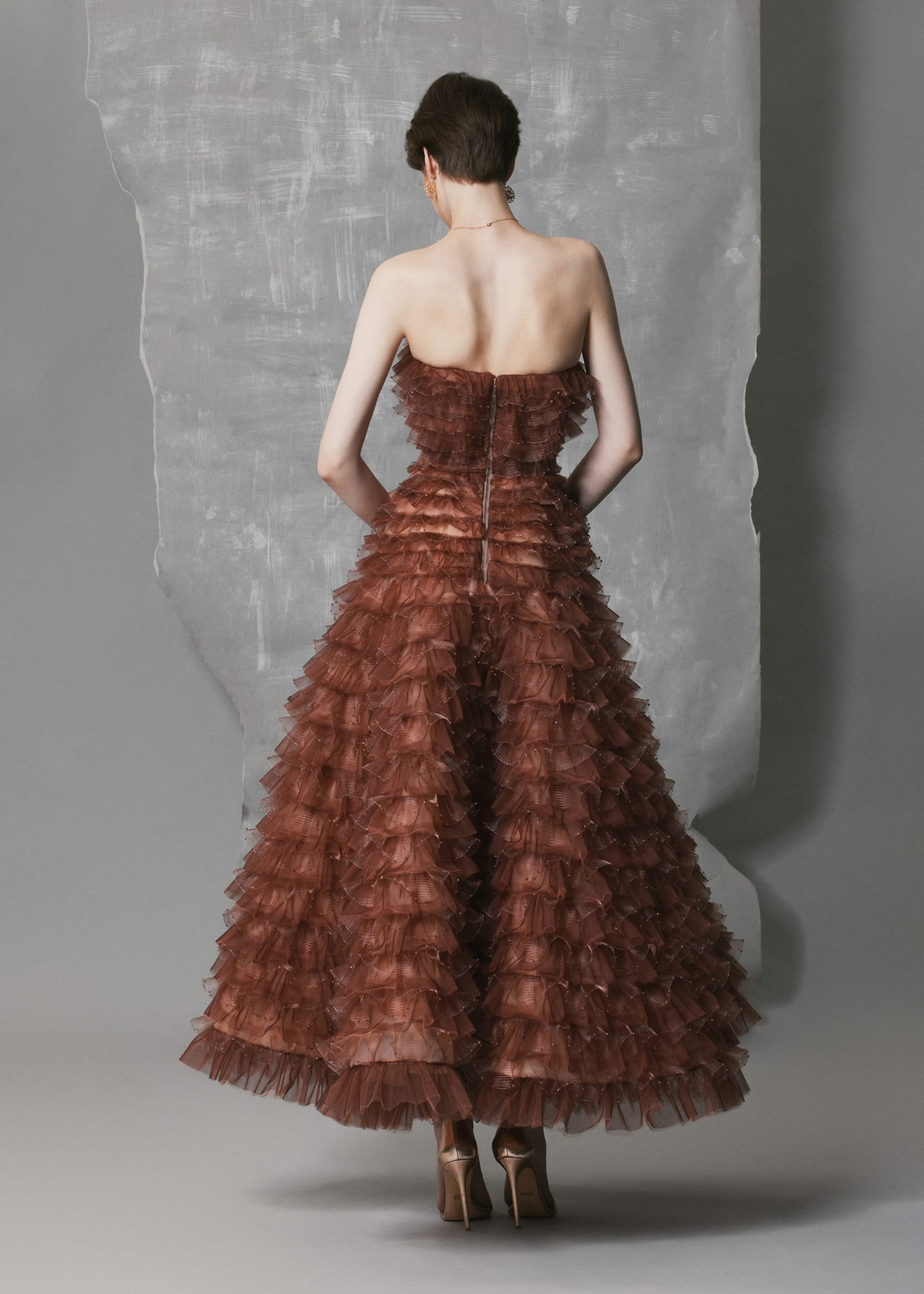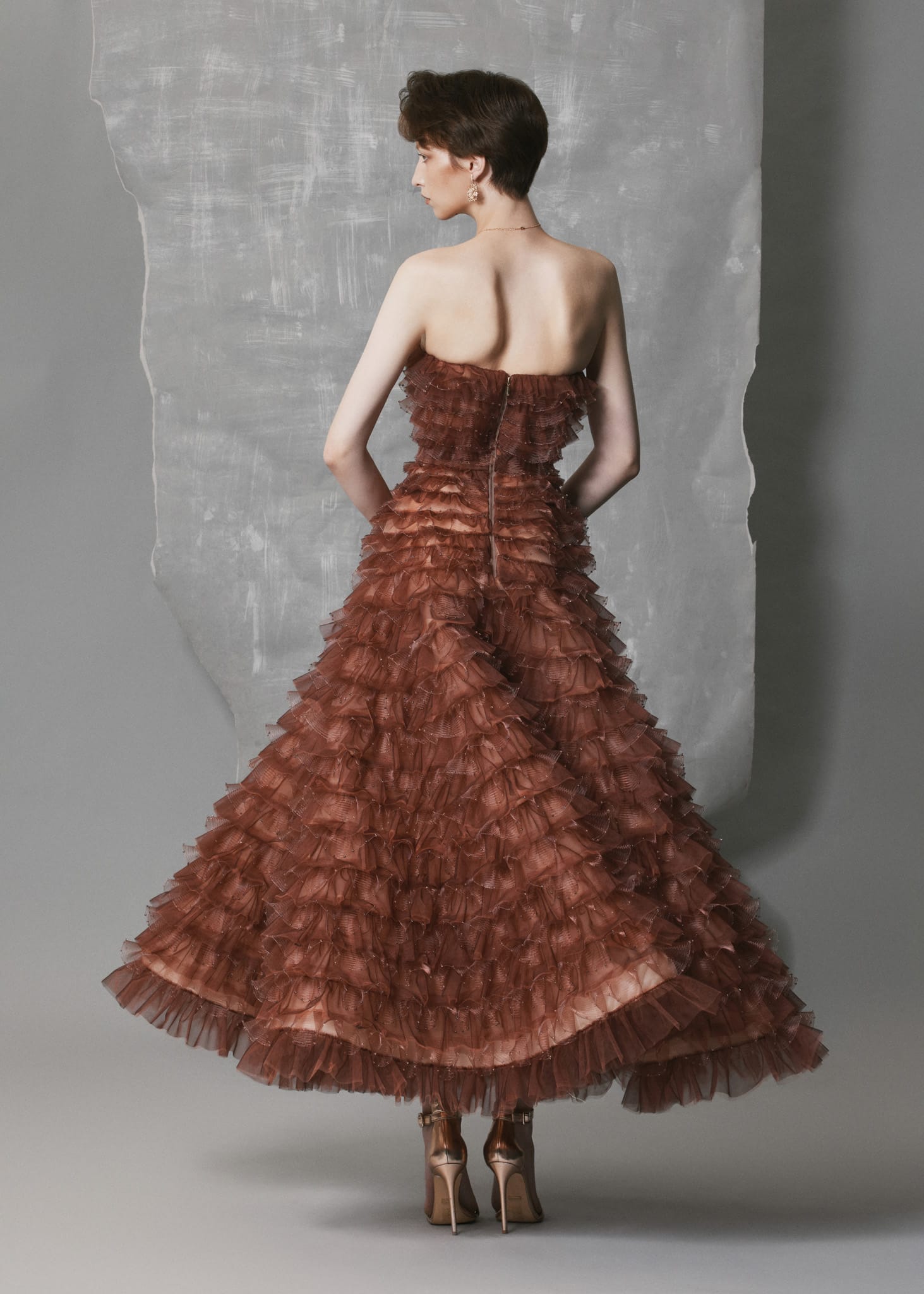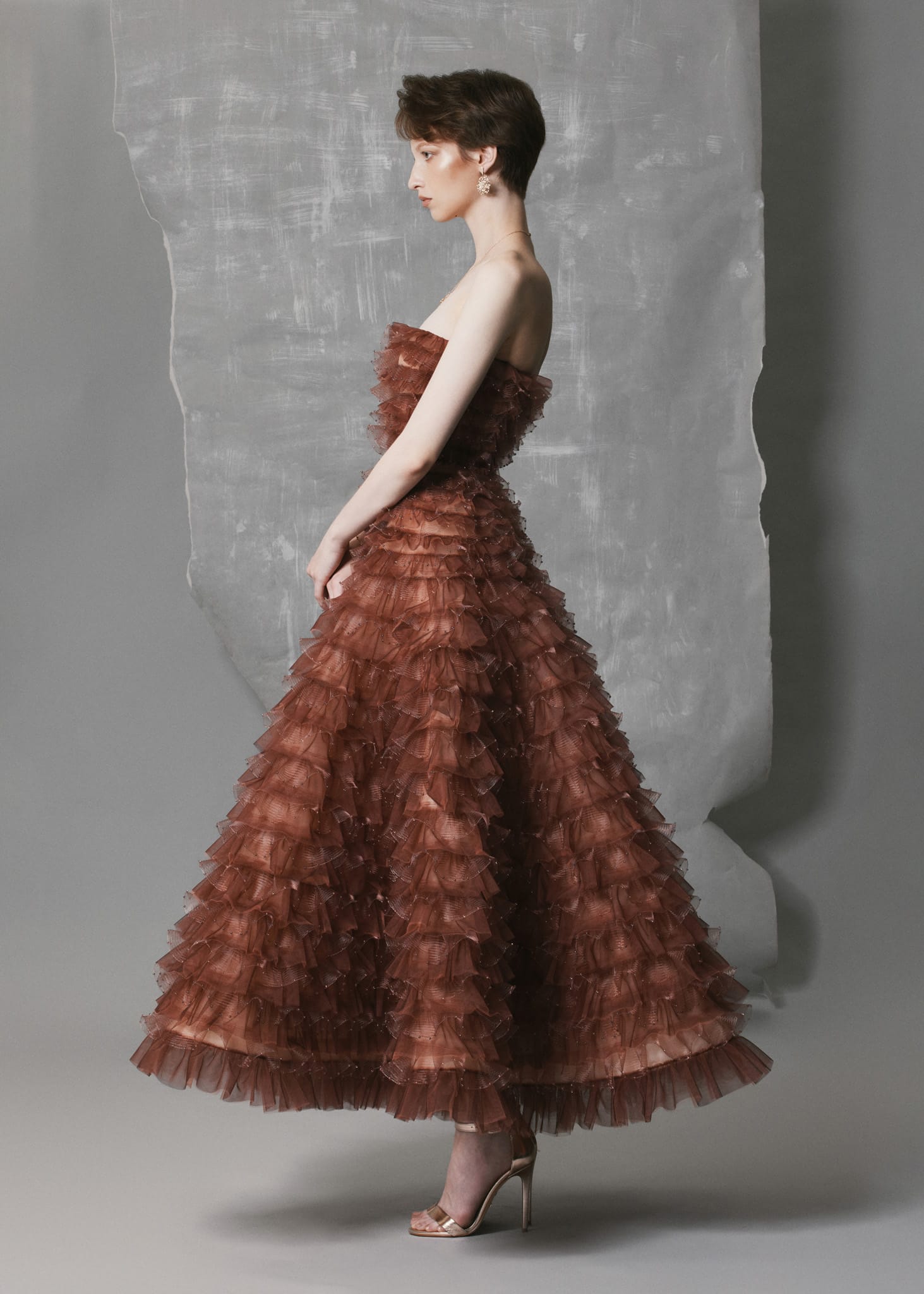 This tiered ruffled mesh gown is crafted from digitally processed stretch mesh and organza, forming cascading ruffle layers that envelop the silhouette with sculptural volume. Each tier is adorned with matching bead accents, creating a unified tone-on-tone shimmer that enhances the warm terracotta hue. The strapless A-line silhouette flows naturally with movement, while the silk-lined interior offers structure, softness, and comfort. This gown delivers fluidity, texture, and refined craftsmanship — a standout choice for formal occasions and artistic evening settings.