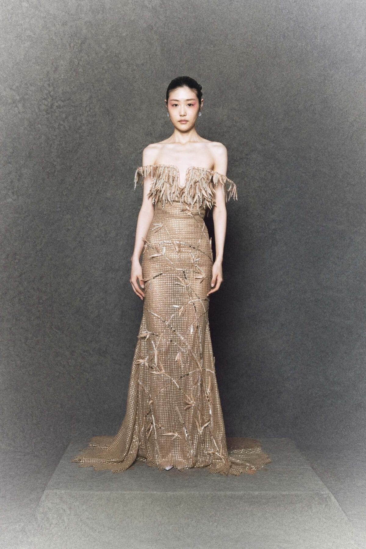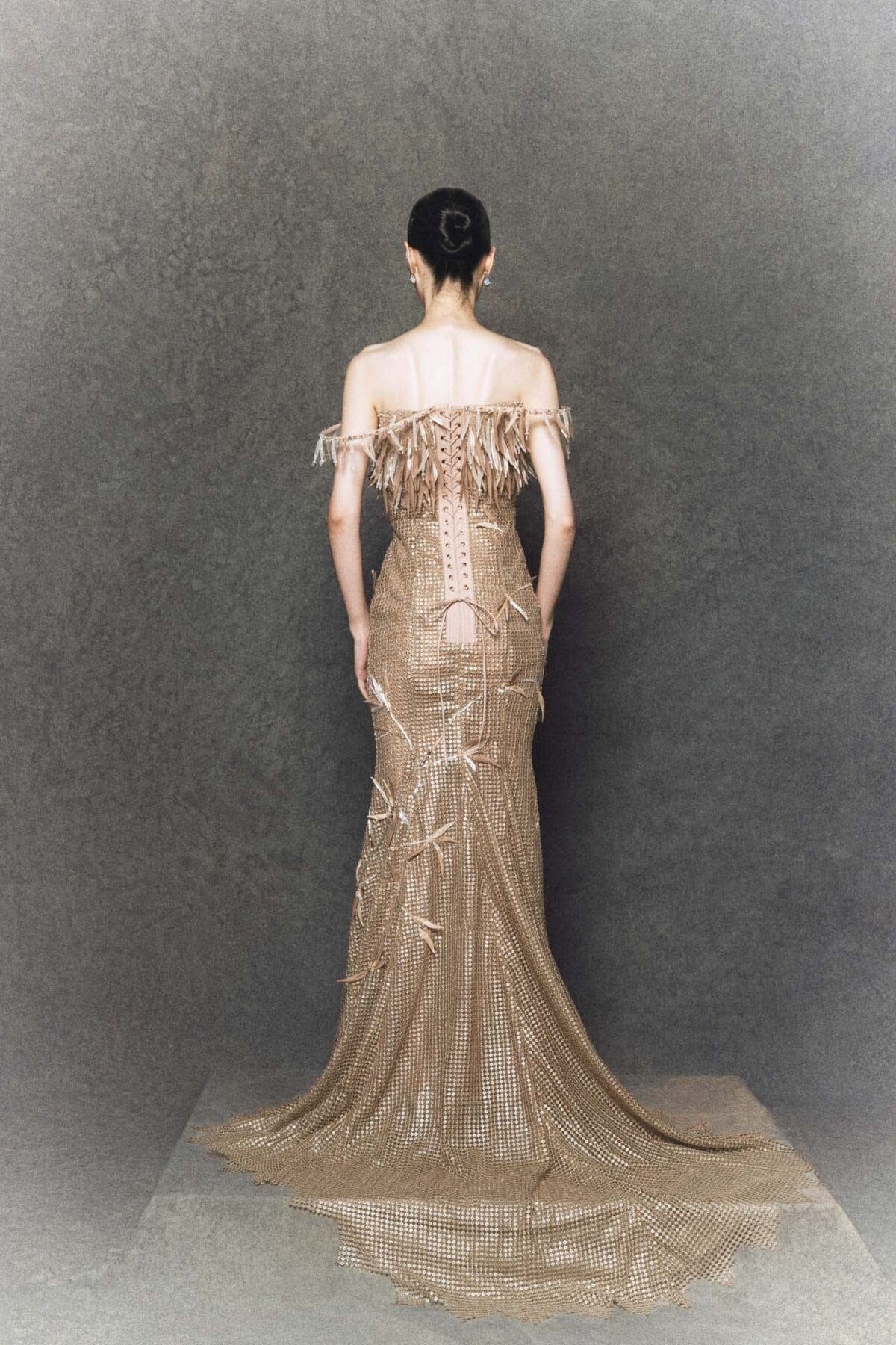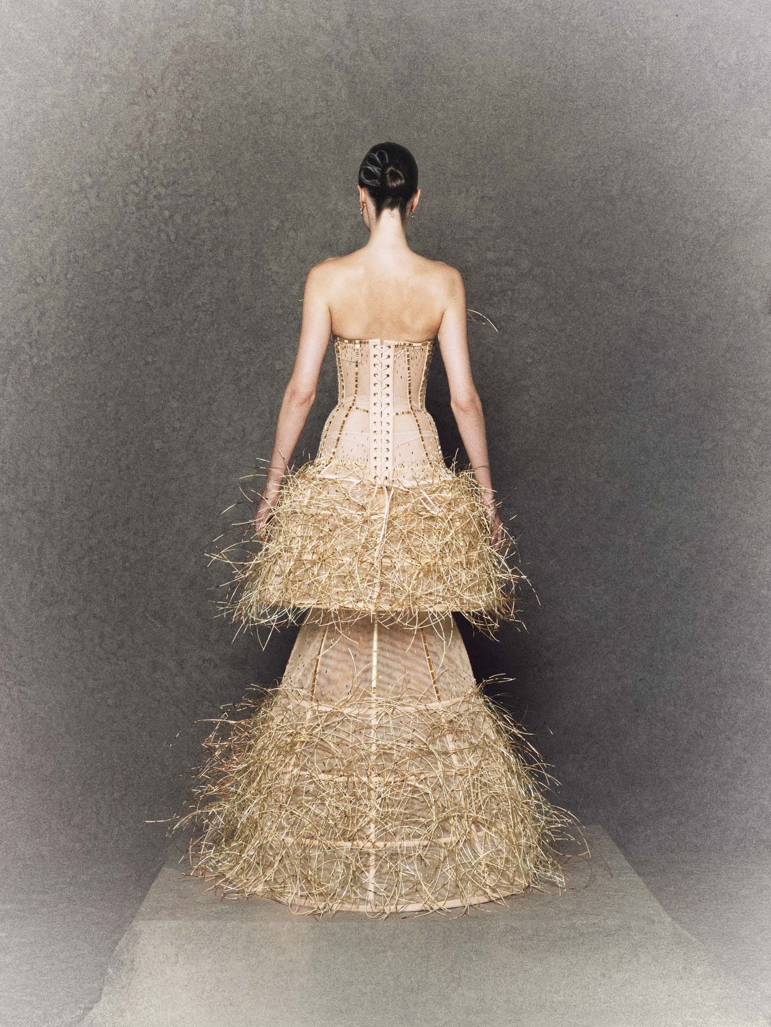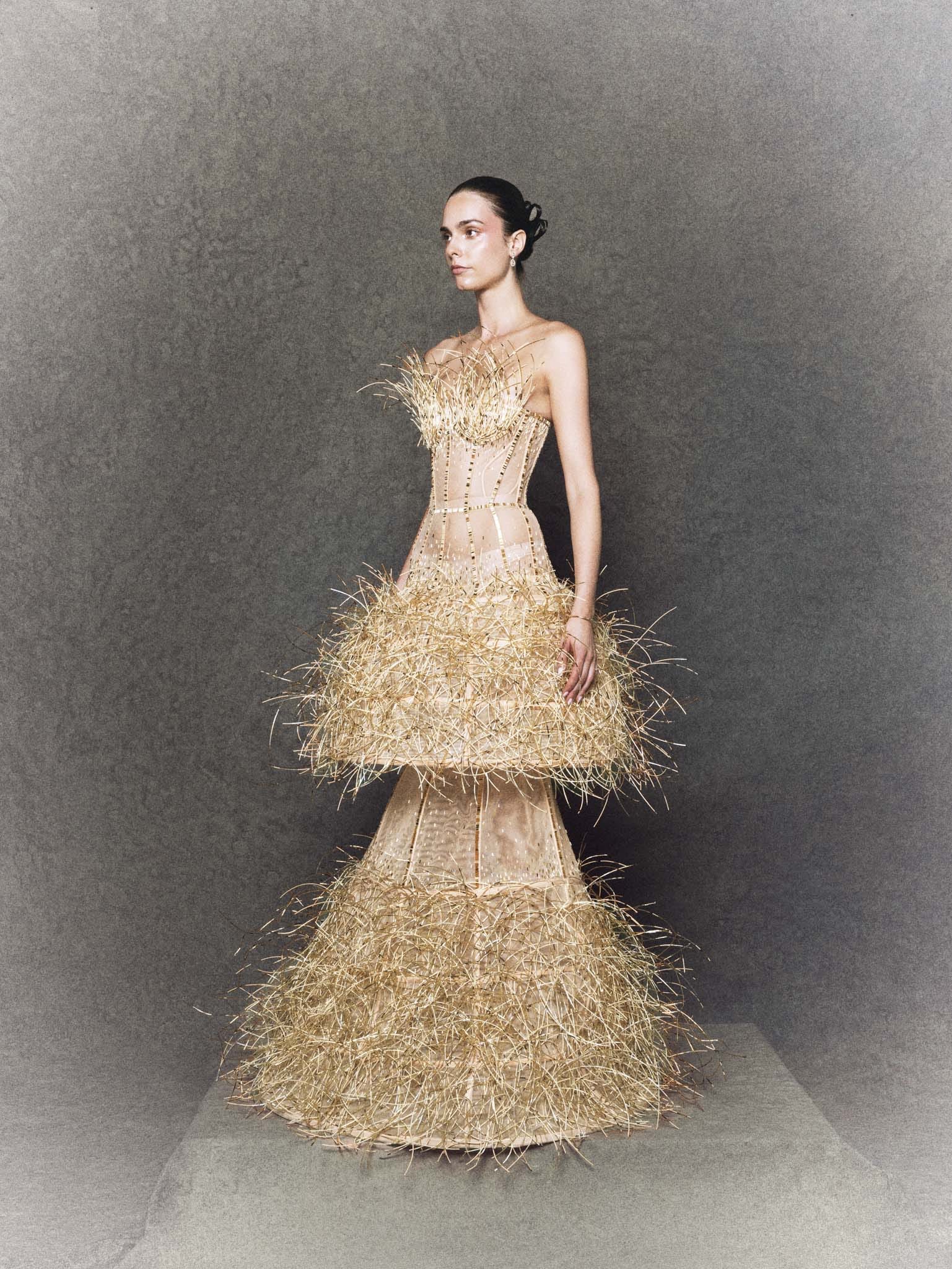 Two-tiered mermaid gown golden bugle beads is meticulously hand-embellished with thousands of golden bugle beads, evoking the glistening texture of straw stacks under the sun. The bodice mirrors the skirt’s intricate craftsmanship, creating seamless harmony in texture and tone. A sheer nude mesh wraps the waist, accentuated by visible corset boning that sculpts and defines the figure. Perfect for weddings, red carpet events, or formal evening occasions.