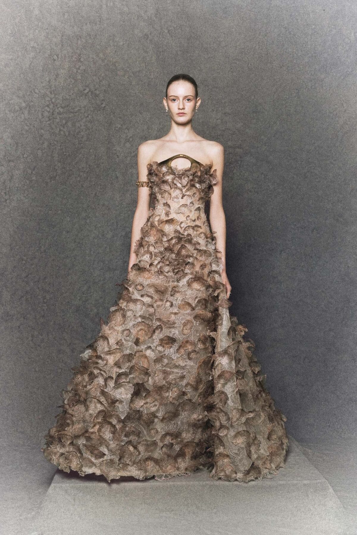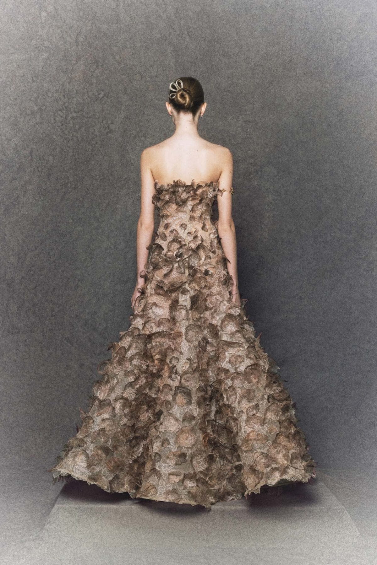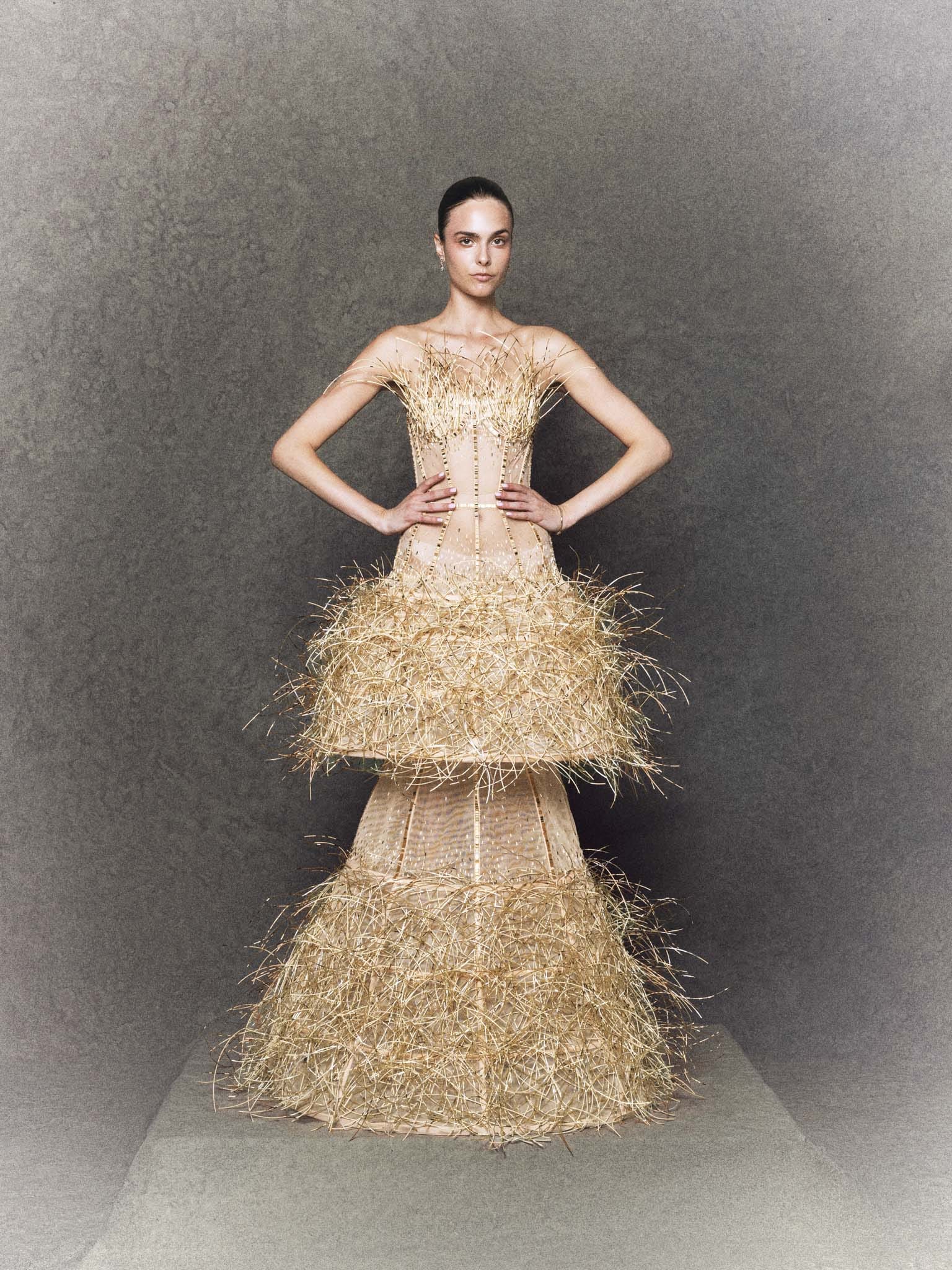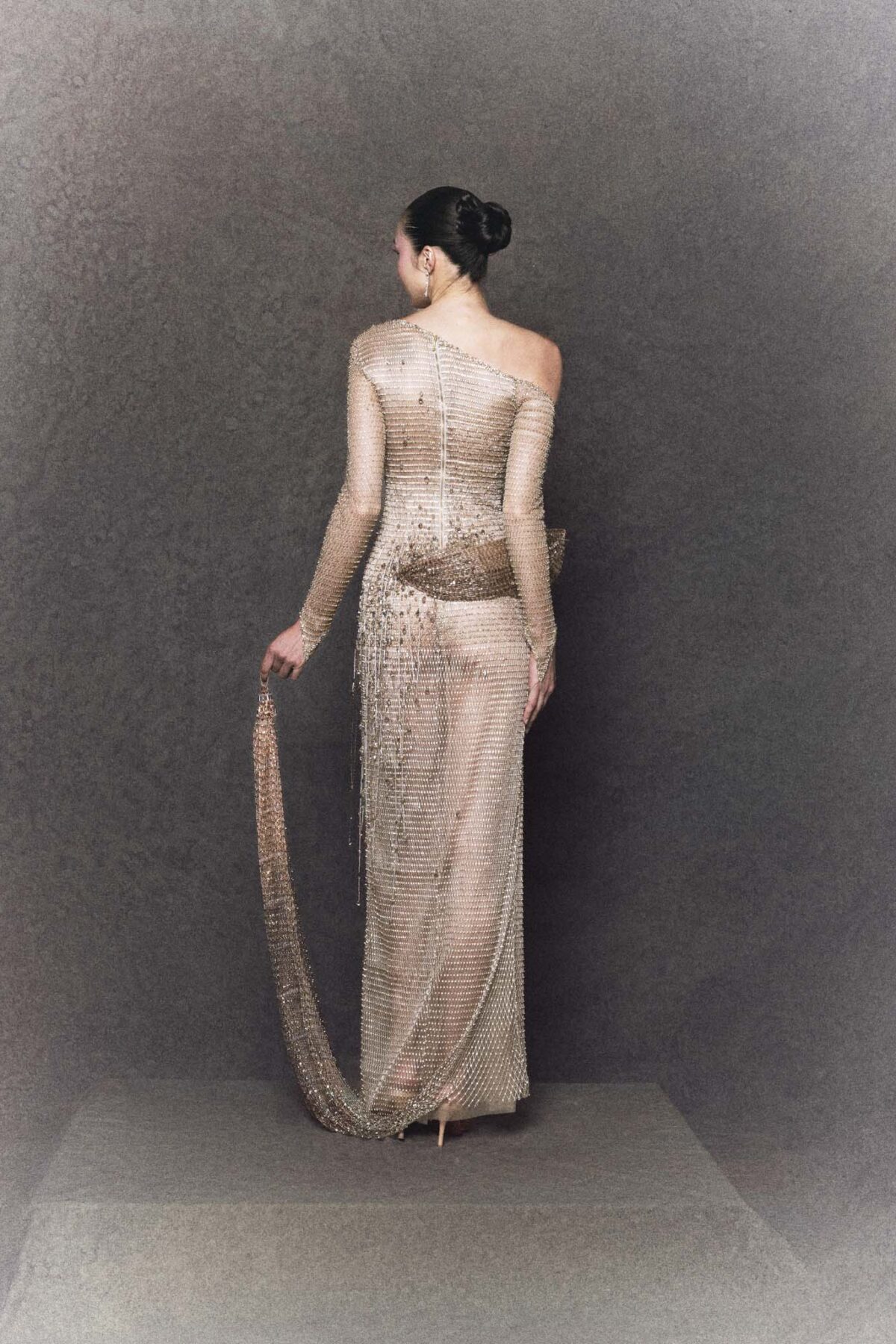 Two-tiered mermaid gown golden bugle beads is meticulously hand-embellished with thousands of golden bugle beads, evoking the glistening texture of straw stacks under the sun. The bodice mirrors the skirt’s intricate craftsmanship, creating seamless harmony in texture and tone. A sheer nude mesh wraps the waist, accentuated by visible corset boning that sculpts and defines the figure. Perfect for weddings, red carpet events, or formal evening occasions.