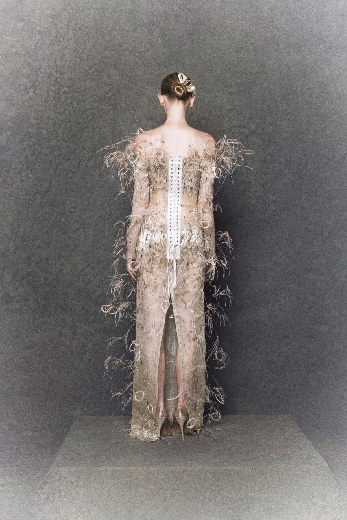 Two-Tiered Mermaid Gown in Golden Bugle Beads with Sheer Mesh Corset Layers