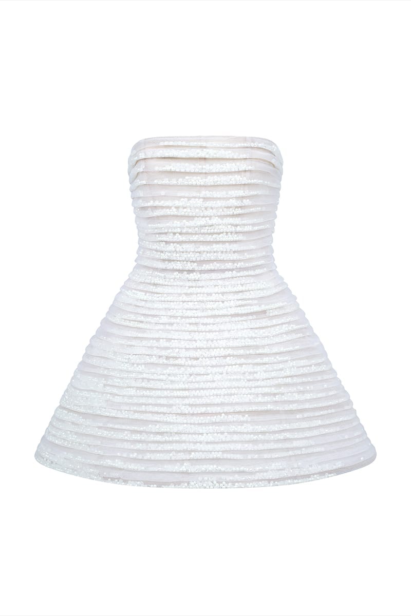 The white short dress is embellished with sparkling beads