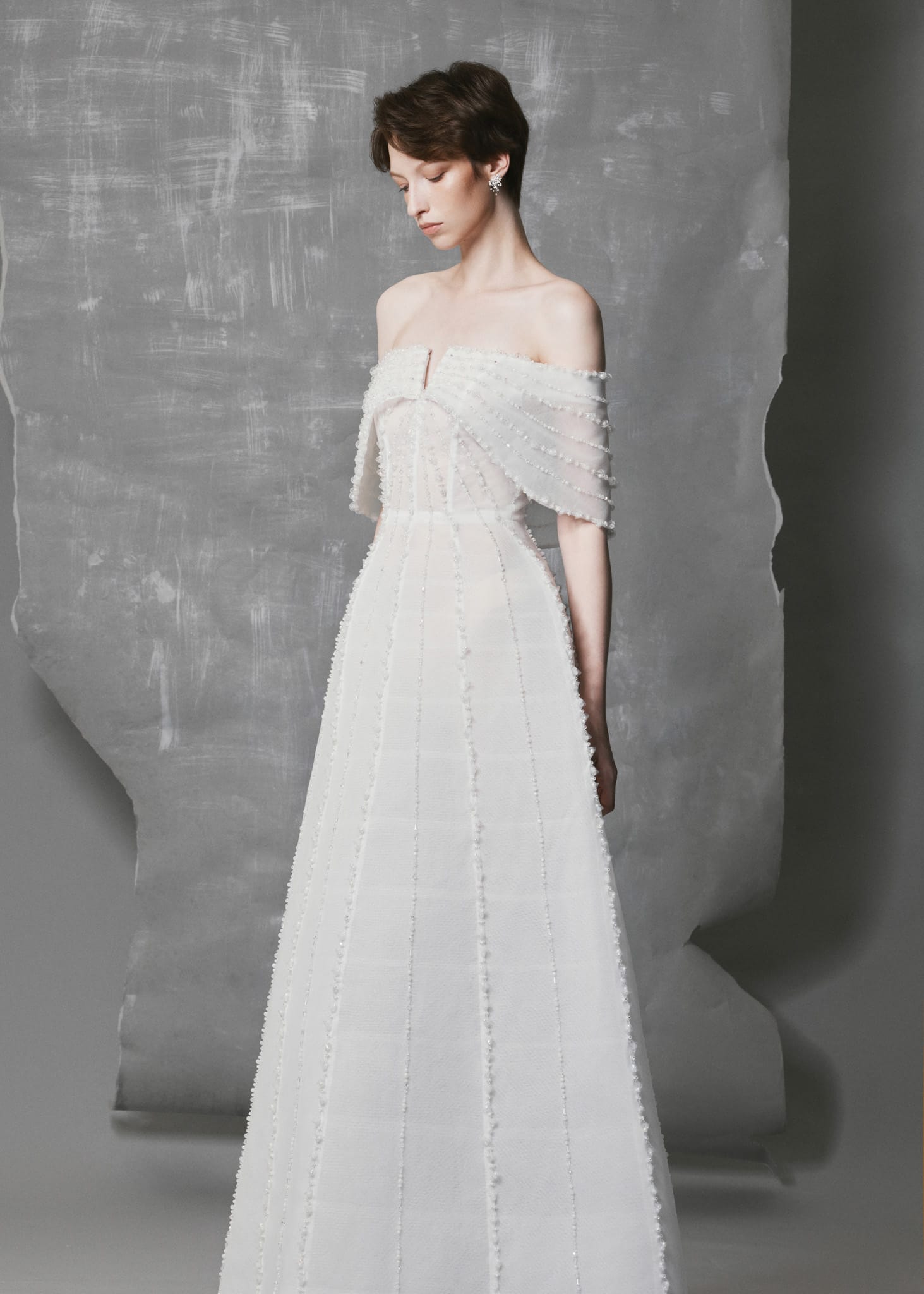 - Silhouette: Off-shoulder A-line gown