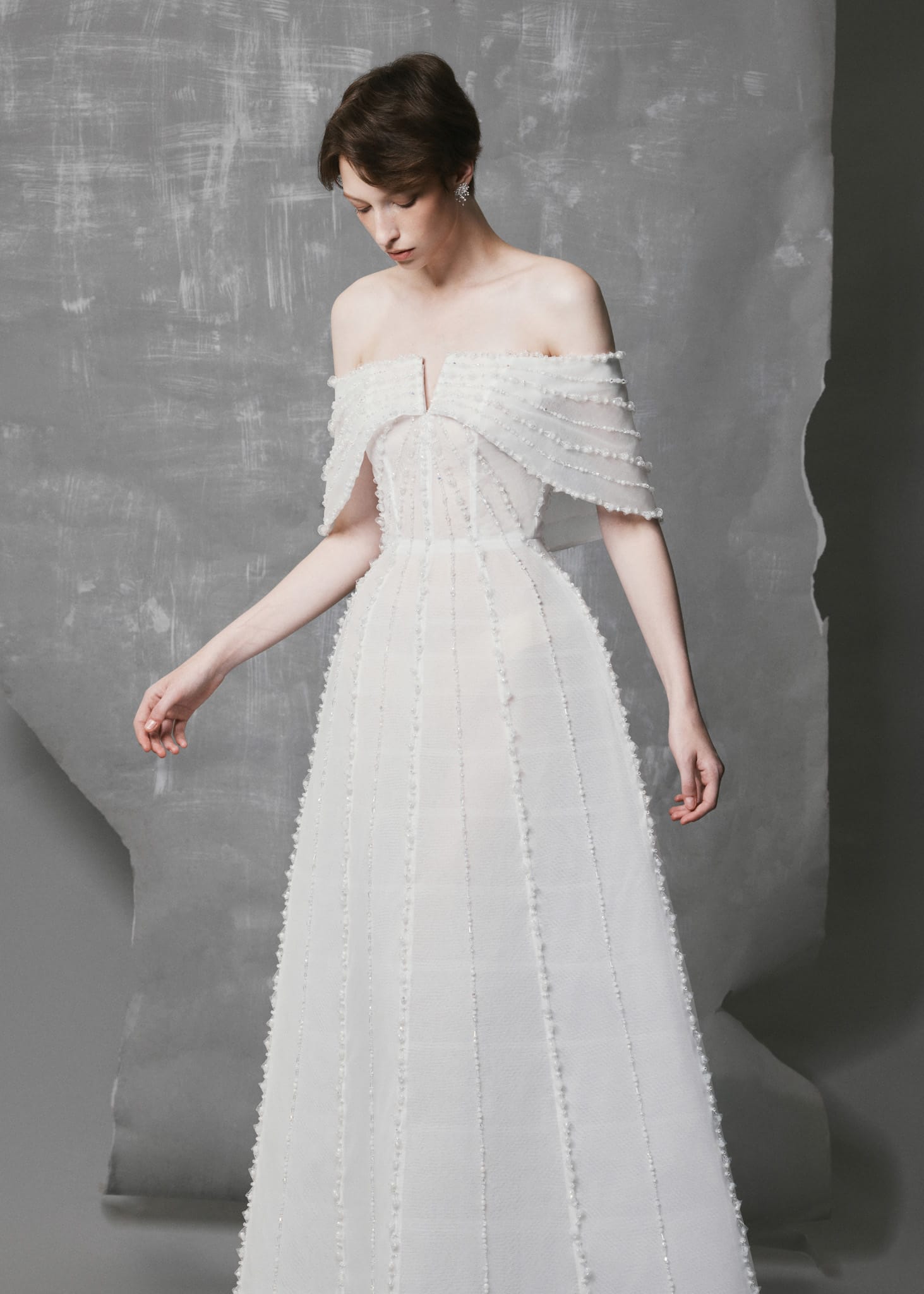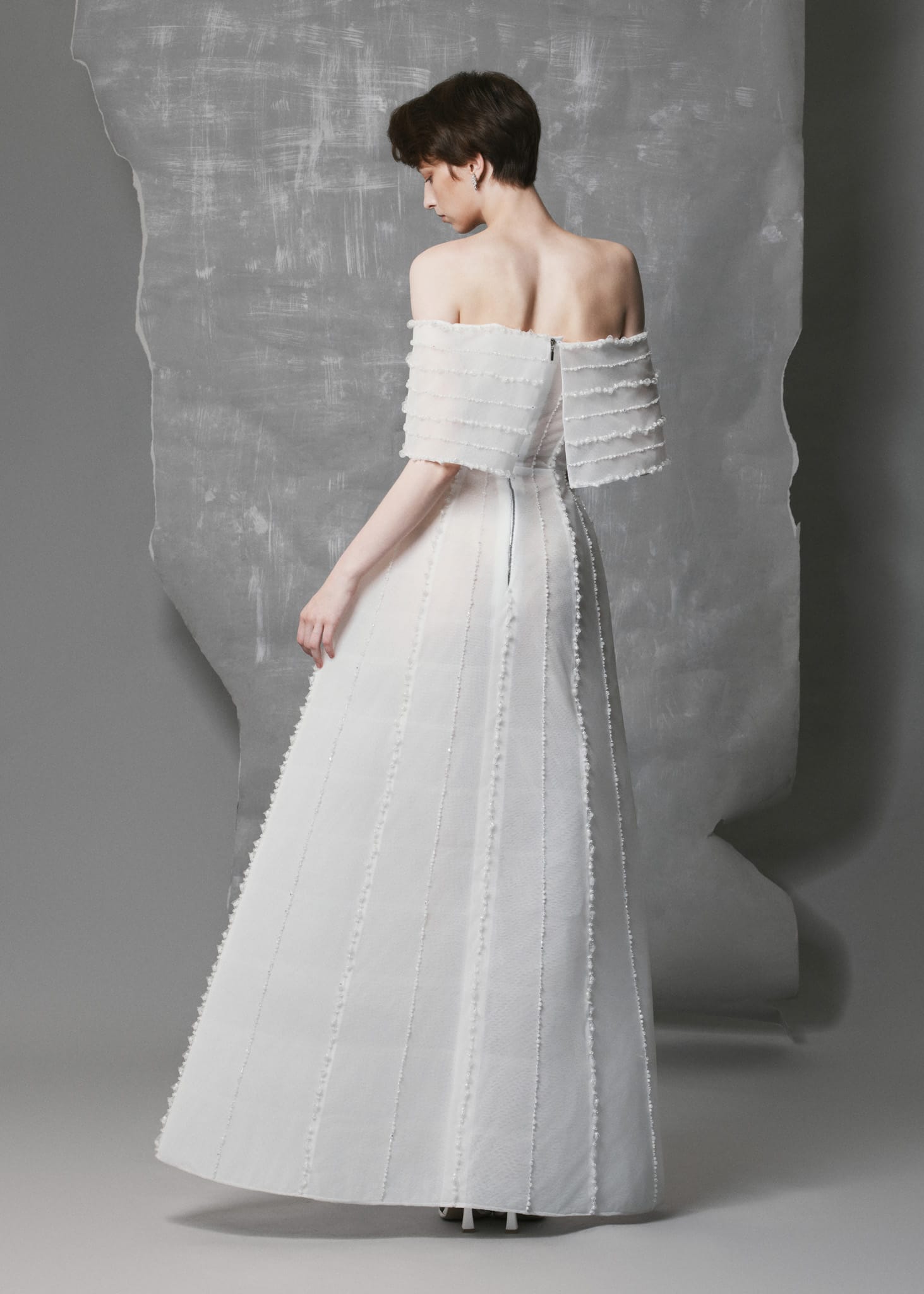 This White Off-Shoulder Mesh Gown is crafted from delicate white mesh and elevated with hand-applied vertical crystal line details that visually elongate the silhouette. The structured bodice flows into a voluminous A-line skirt, blending softness with architectural refinement. Each crystal line catches the light subtly, creating a quiet yet luminous sophistication—perfect for formal evenings, galas, or special events.